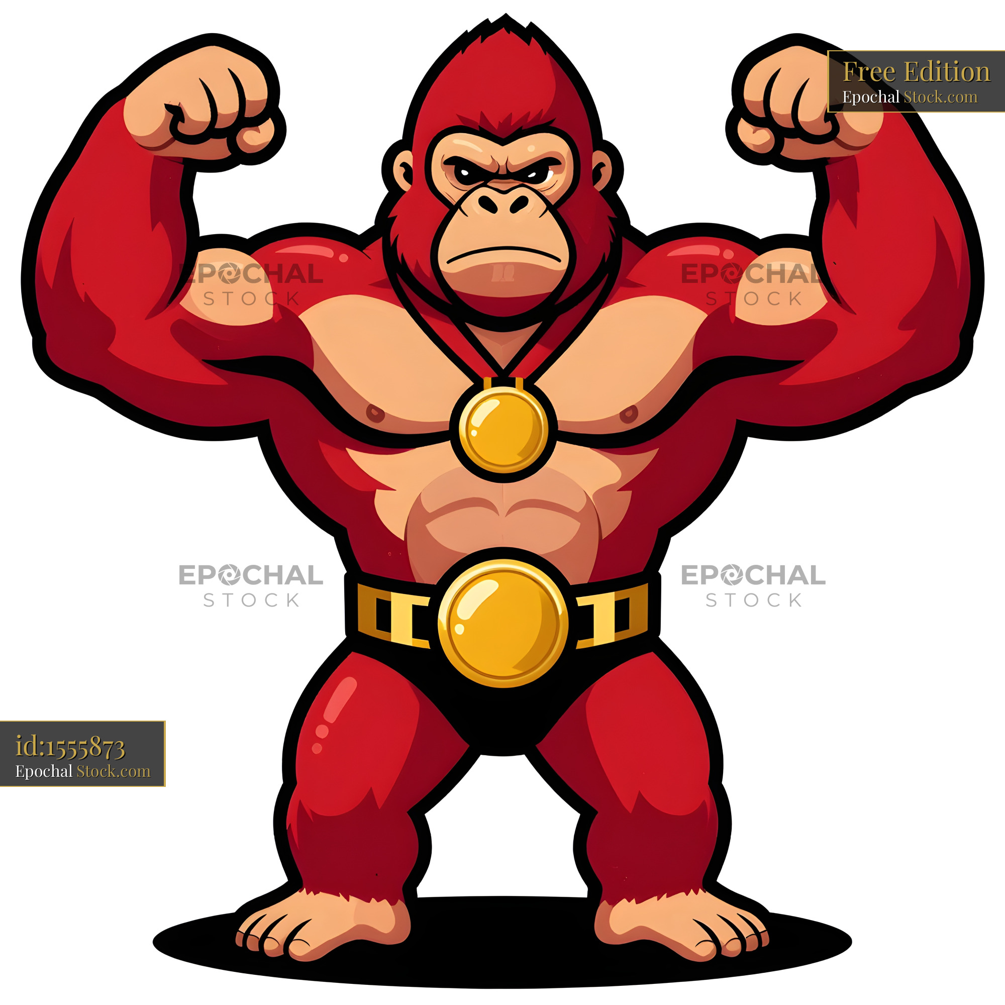 A strong character with red fur poses with arms raised. The character has a gold medal around the neck and wears a black belt. It looks ready for action.