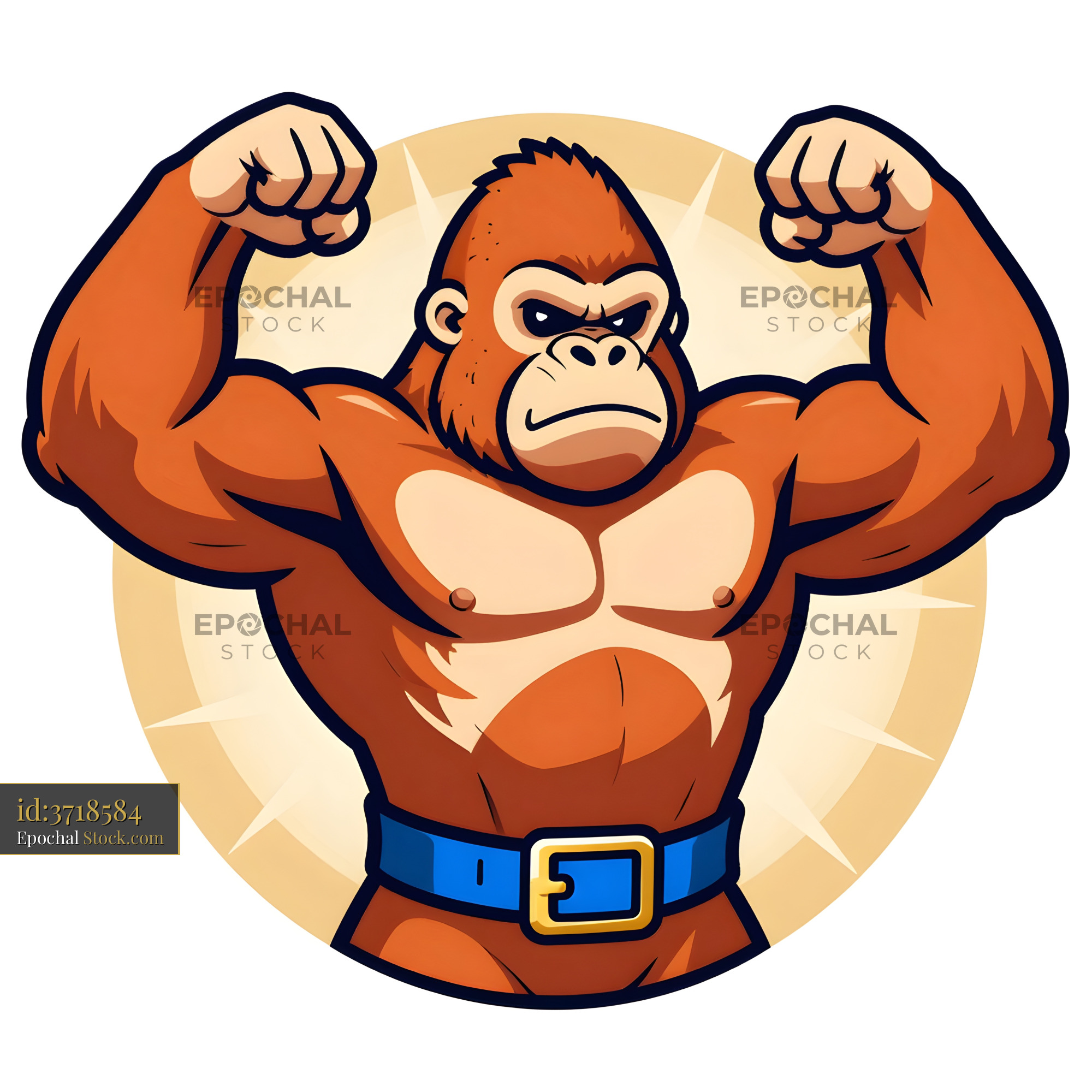 A strong gorilla stands with its arms raised, showing off muscles. The gorilla has a serious look and wears a blue belt. A bright background highlights the scene.