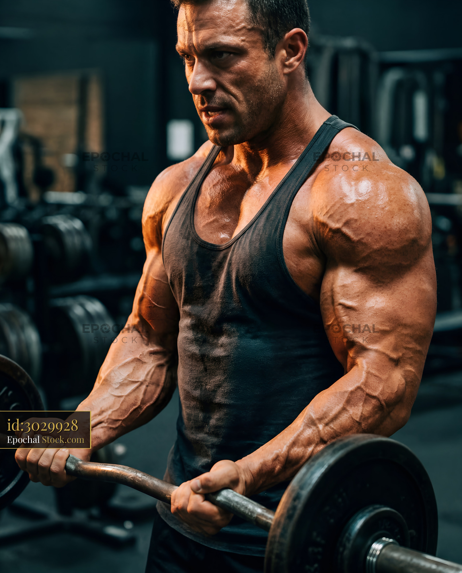 A man exercises in a gym, lifting a barbell. He focuses on his movement and shows strong muscles. The gym has many weights and equipment around him.