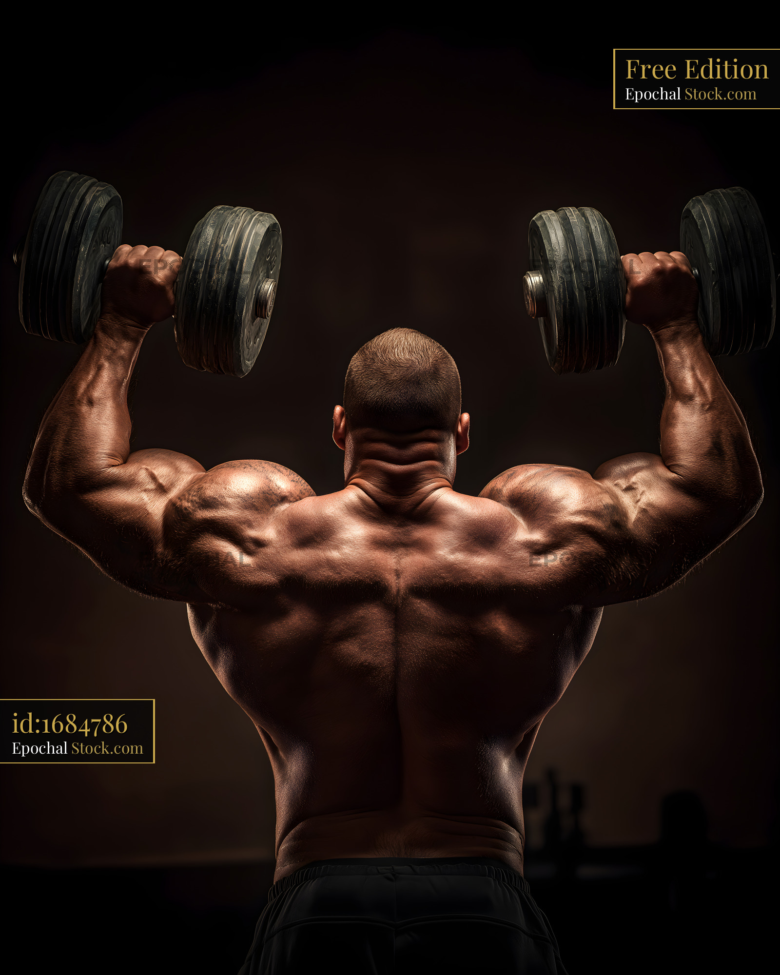 A man is lifting heavy dumbbells in a gym. He stands with his back to the viewer. The setting is dark with bright lights, making his muscles stand out as he trains.