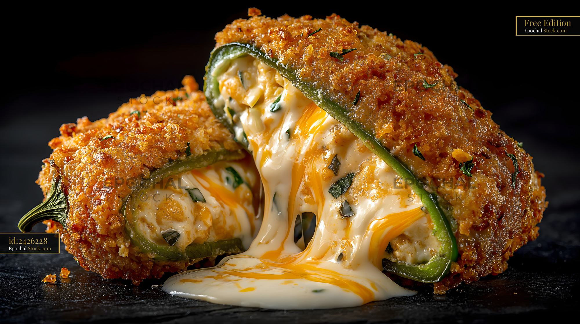 A stuffed jalapeno pepper is shown with melted cheese spilling out. The pepper is breaded and deep fried, creating a crunchy texture on the outside. It is placed on a dark surface.
