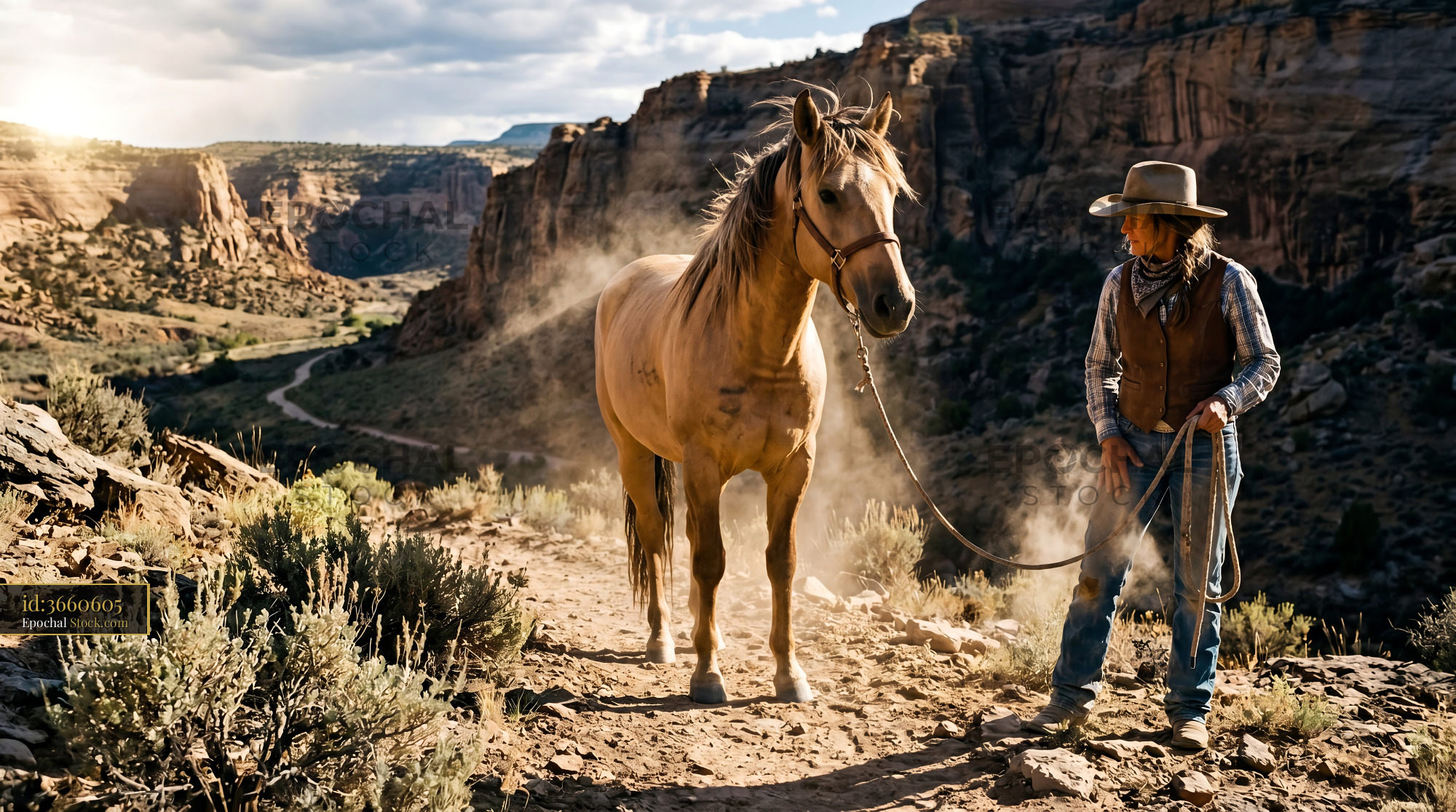 This cinematic Western landscape features a buckskin horse and cowgirl. Perfect for rustic home decor, quilting cotton, or unique wallpaper in a ranch-style setting.