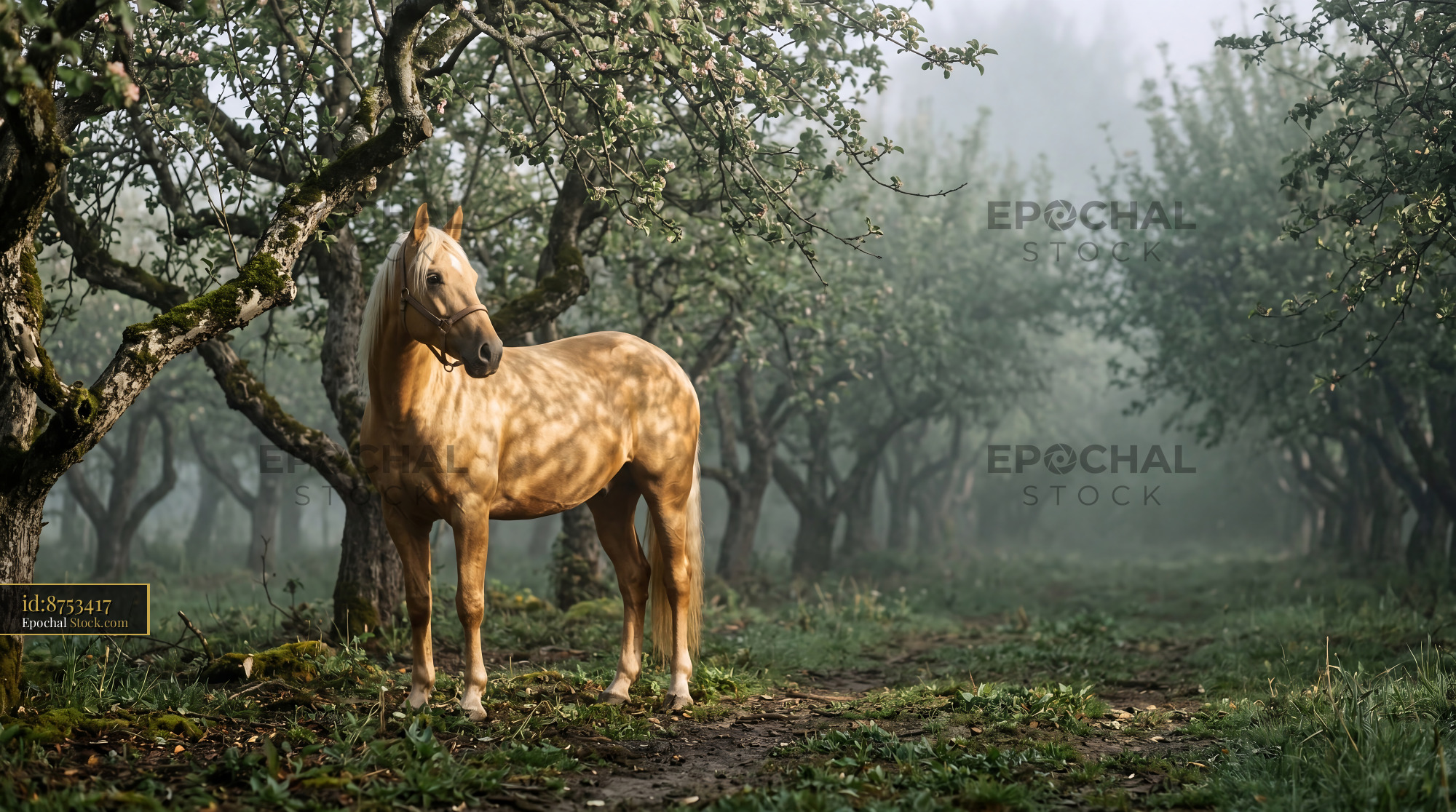 This ethereal horse pattern features a golden palomino in a misty orchard. Perfect for equestrian home decor, nursery wallpaper, and unique quilting fabric or gift wrap.