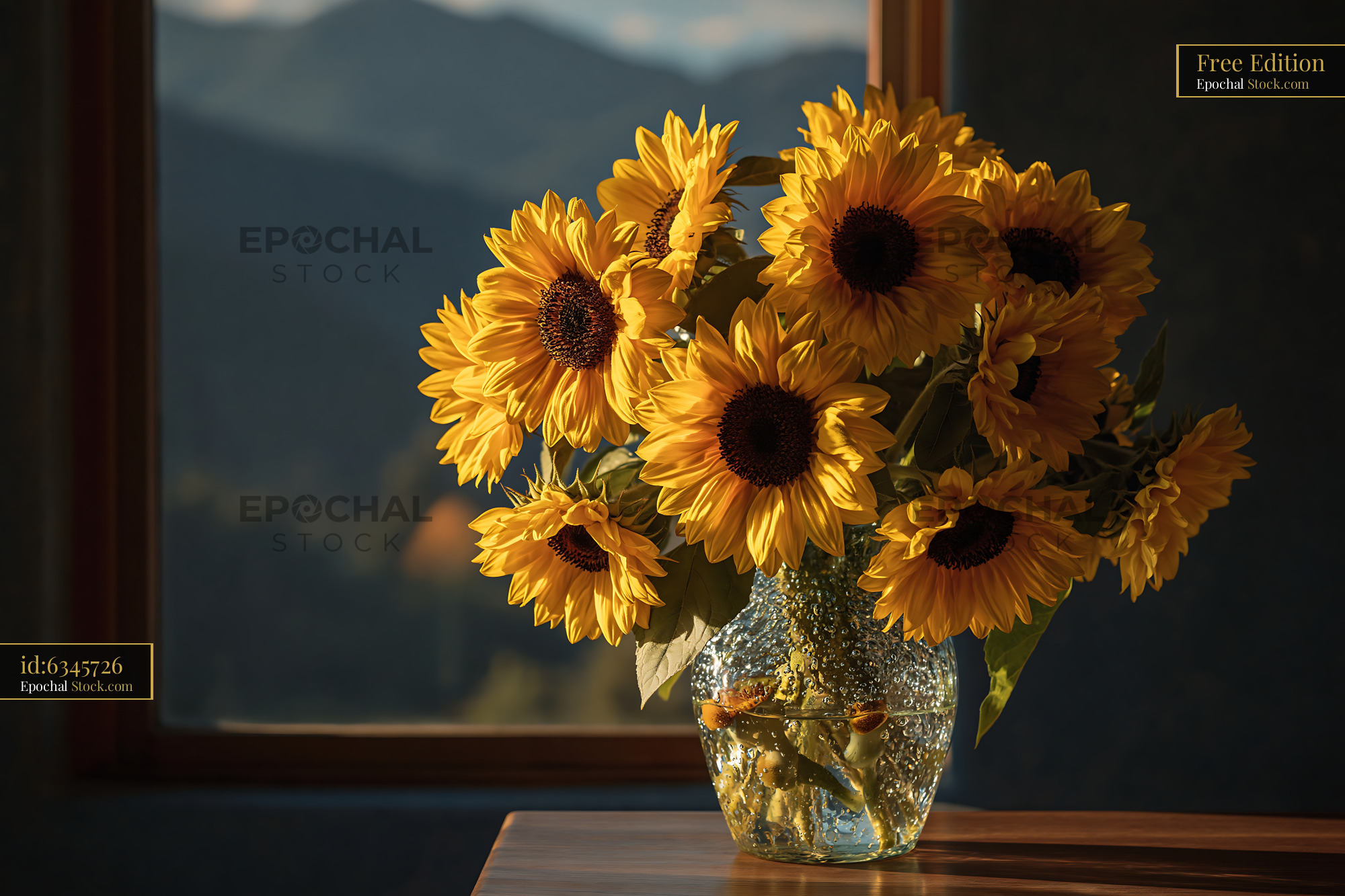 A vibrant bouquet of sunflowers sits in a textured glass vase, catching warm golden light against a soft mountain backdrop, evoking a sense of peaceful rustic living and autumnal warmth.