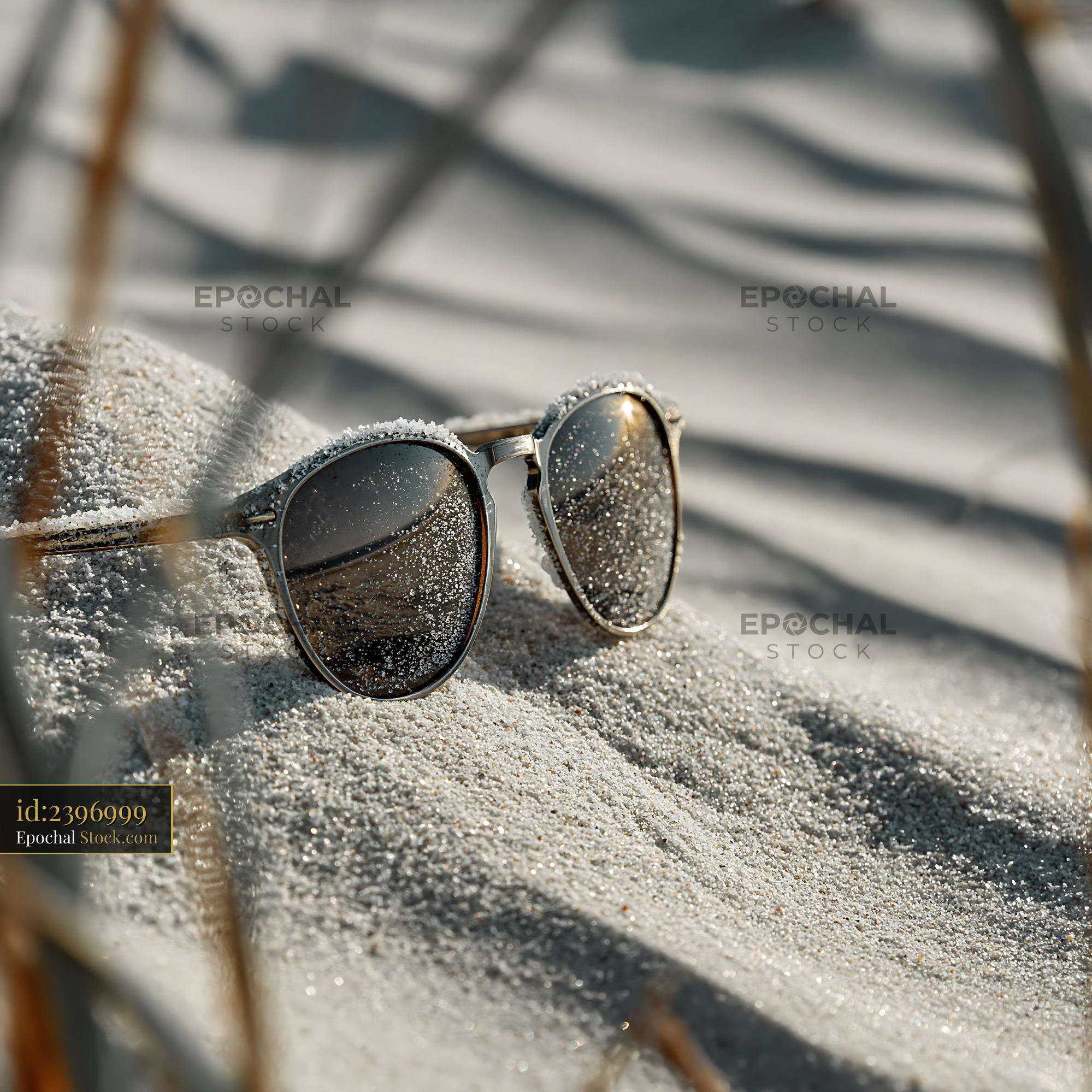 Sunglasses covered in sand and frost on a sunny beach dune