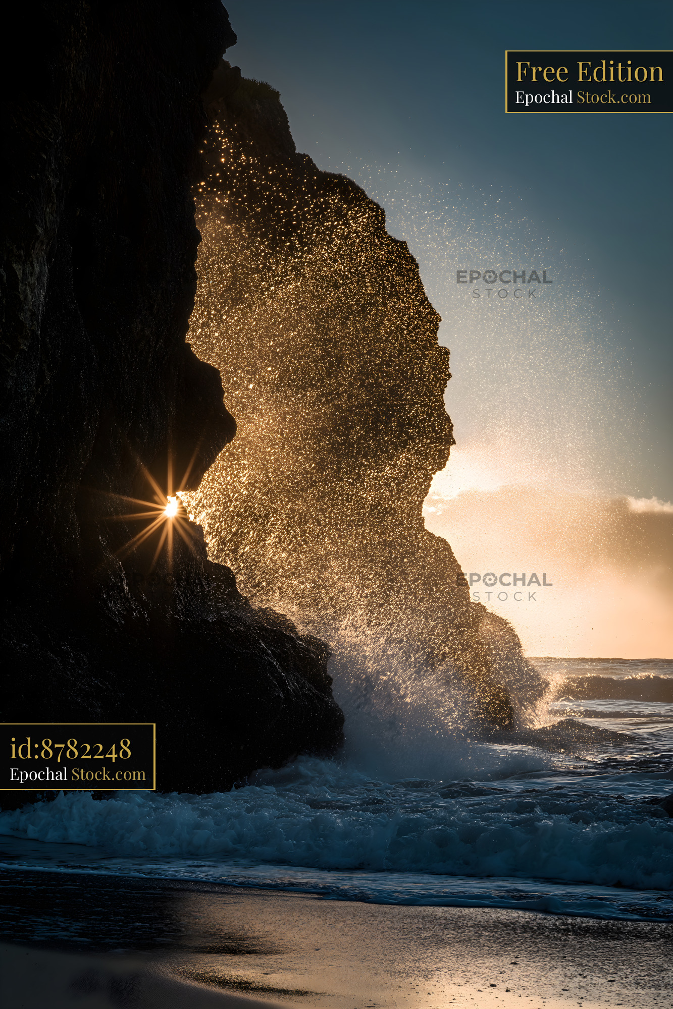 Bright sunlight breaks through rock formations as waves hit the coast. Water sprays up from the impact, creating a lively scene during sunset. The sky shows orange and blue hues.