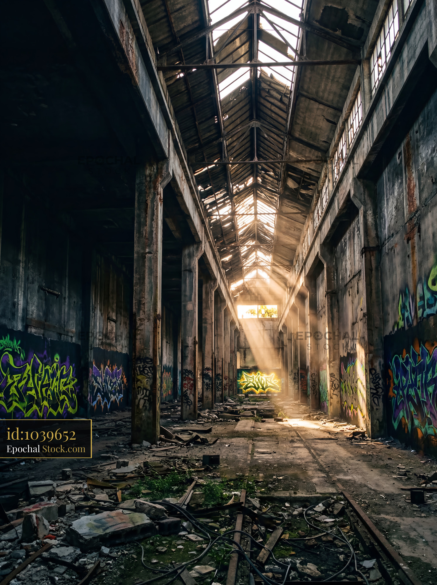 Sunlight shines through the roof of an empty warehouse. The walls are covered with colorful graffiti. The floor is dusty and filled with debris. Plants grow in some places, adding to the scene.