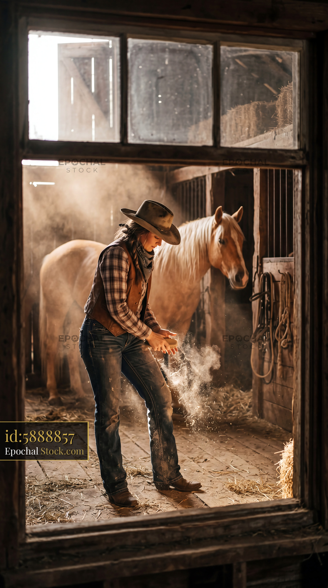 Sunlit Cowgirl and Palomino Horse in Hayloft