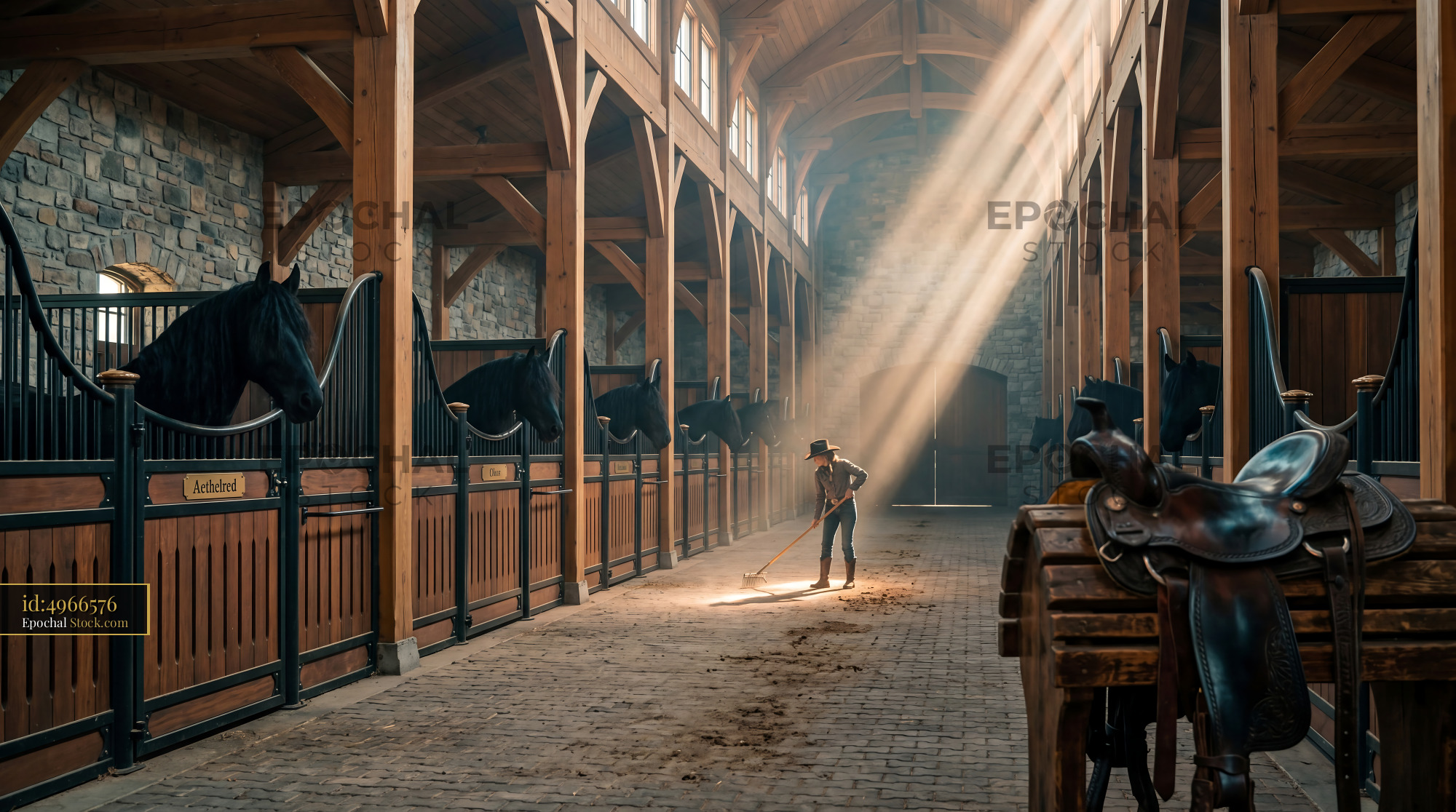 A cinematic scene of a cowgirl in a sunlit stable with Friesian stallions. Perfect for equestrian home decor, rustic quilting fabric, and dramatic wallpaper.