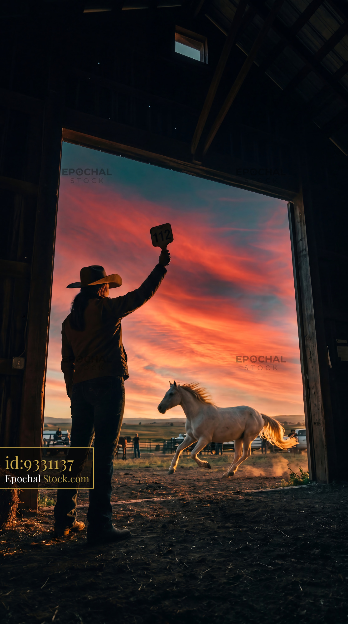 Sunset Cowgirl Bidding Horse Sale Silhouette