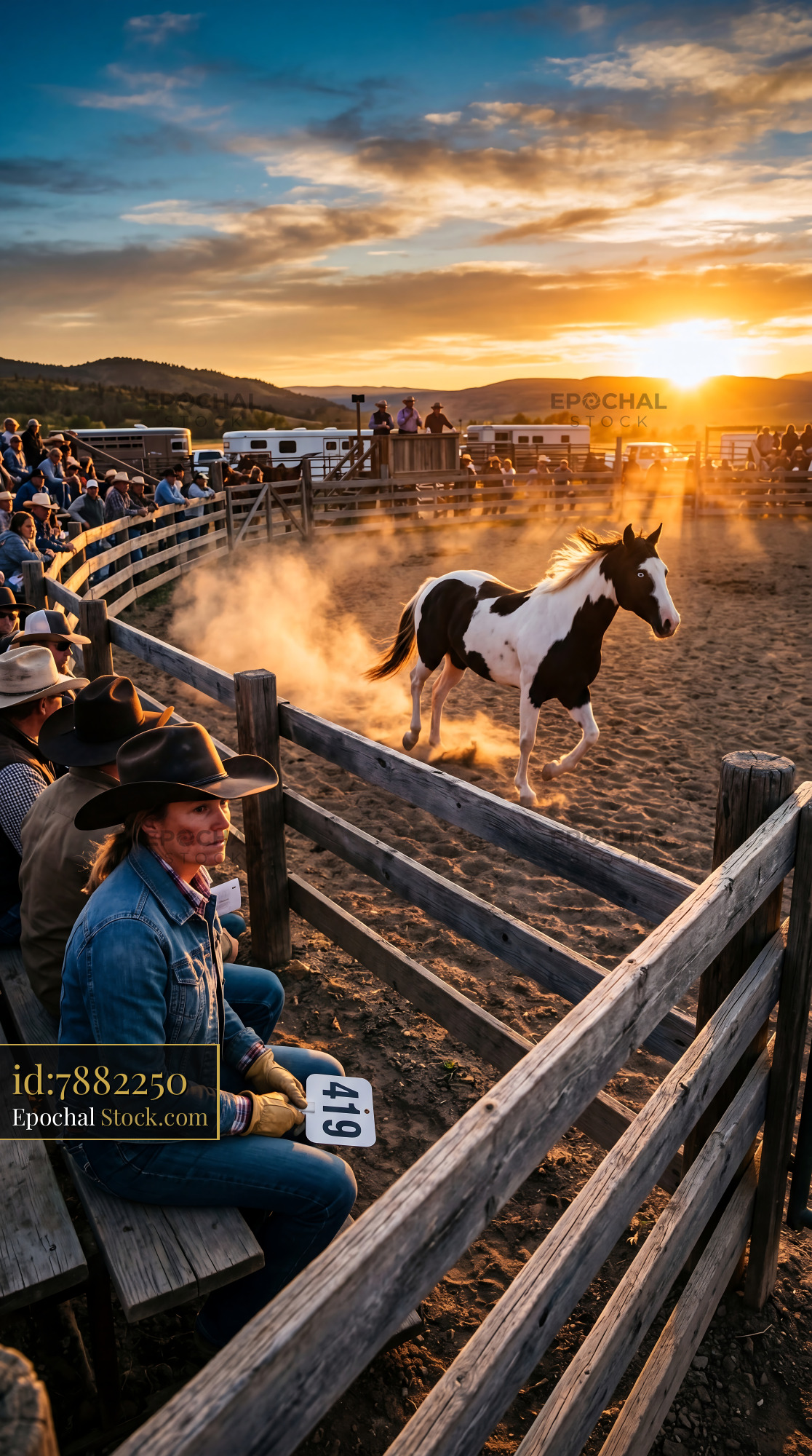 This western landscape pattern features a pinto horse at a sunset auction. Perfect for ranch home decor, quilting cotton, rustic wallpaper, and equestrian gift wrap.