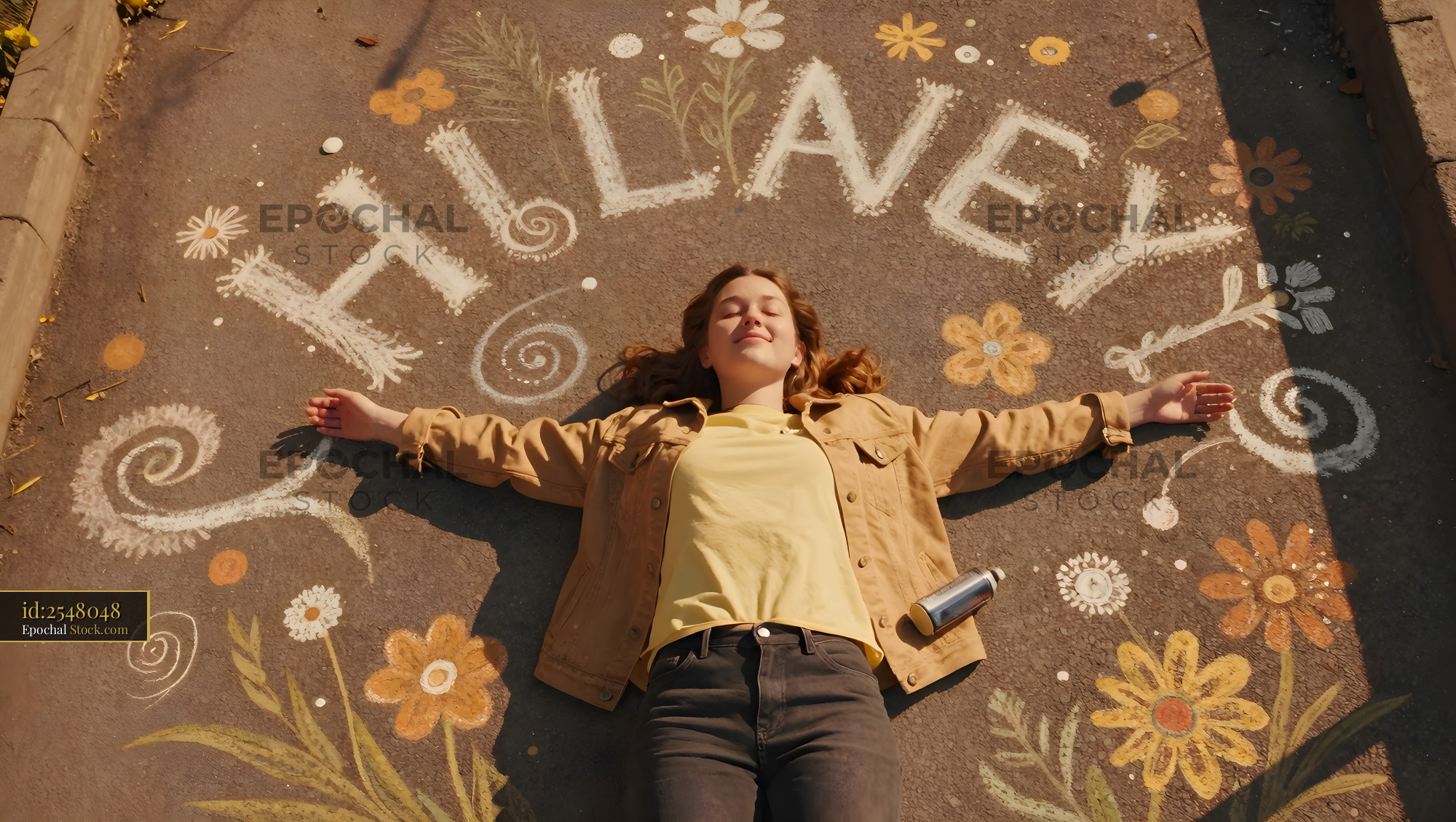 A person lies on a street surrounded by colorful chalk drawings. The artist has created the word Hilaney along with flowers and swirls. The scene takes place during bright daylight.