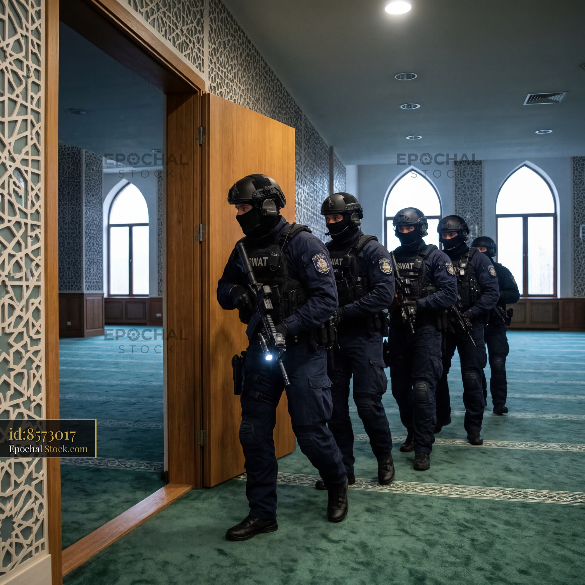A group of SWAT team members is entering a room during a training exercise in a large building. The team is wearing tactical gear and moving in formation.