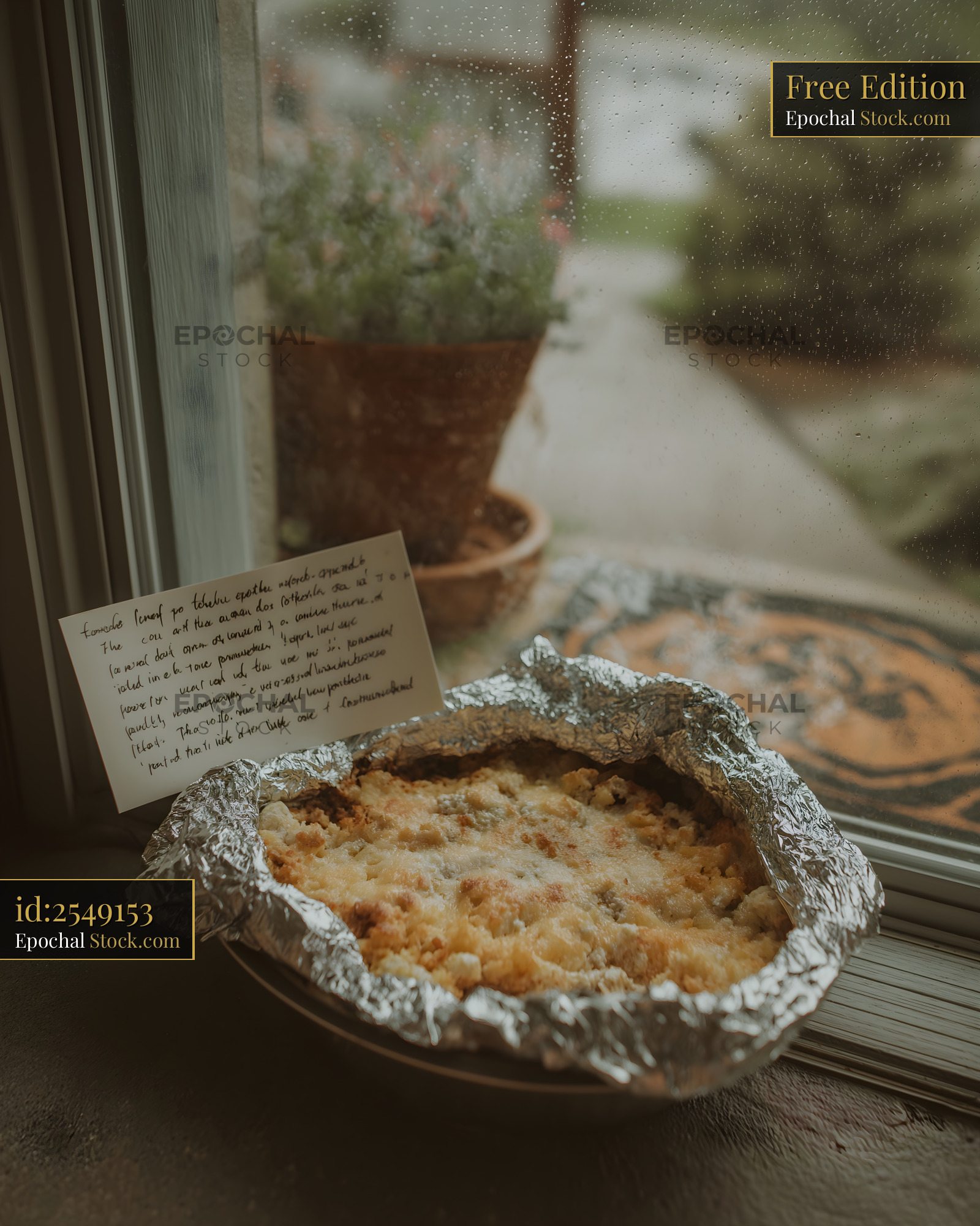 A fruit dessert sits on a table beside a window. The dessert is covered in foil and has a handwritten note next to it. Outside, raindrops fall on the glass and plants are visible.