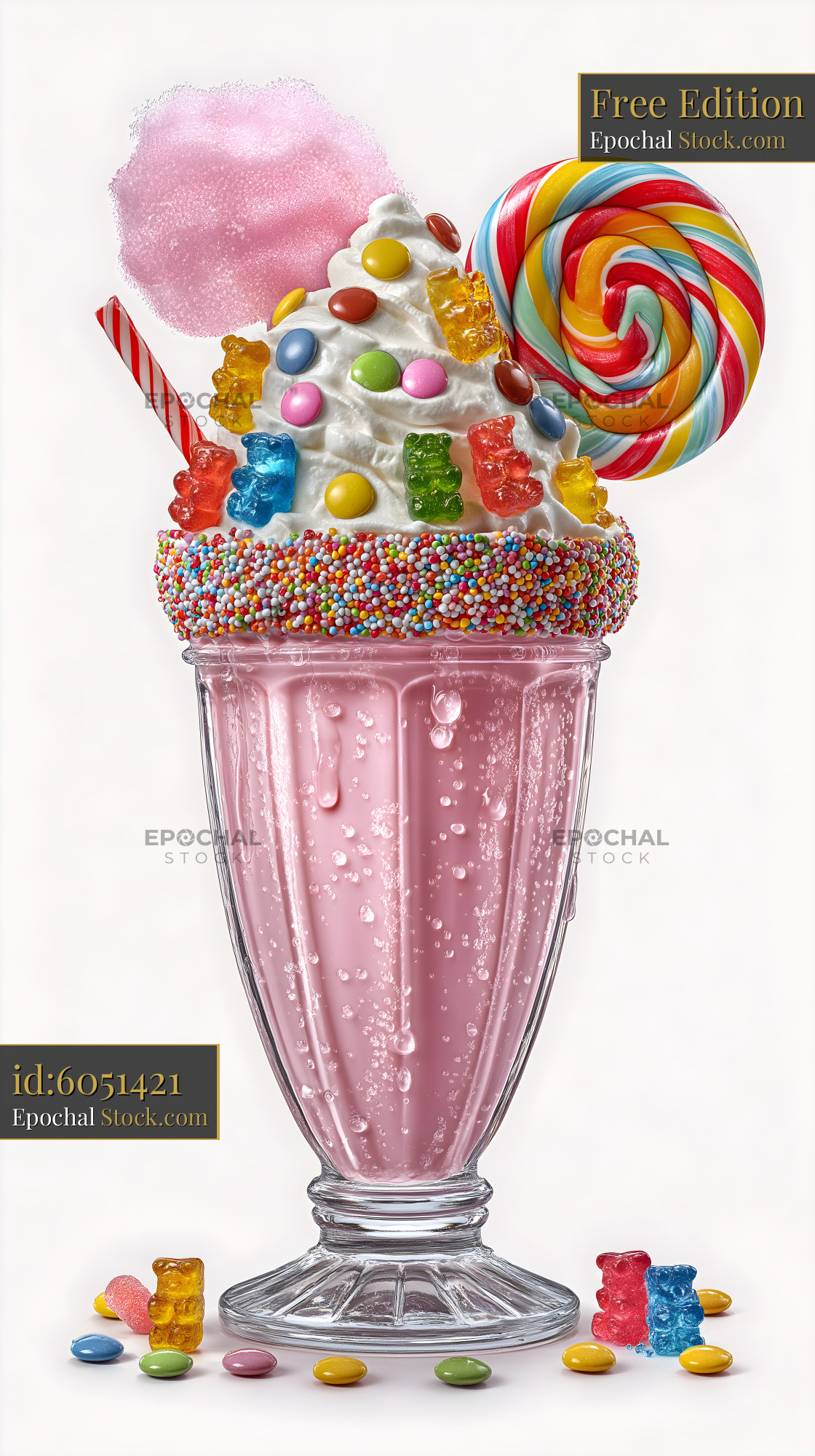 A tall glass holds a pink dessert drink topped with whipped cream. Colorful candy, a lollipop, and cotton candy are placed on top. Small candies lay around the glass.
