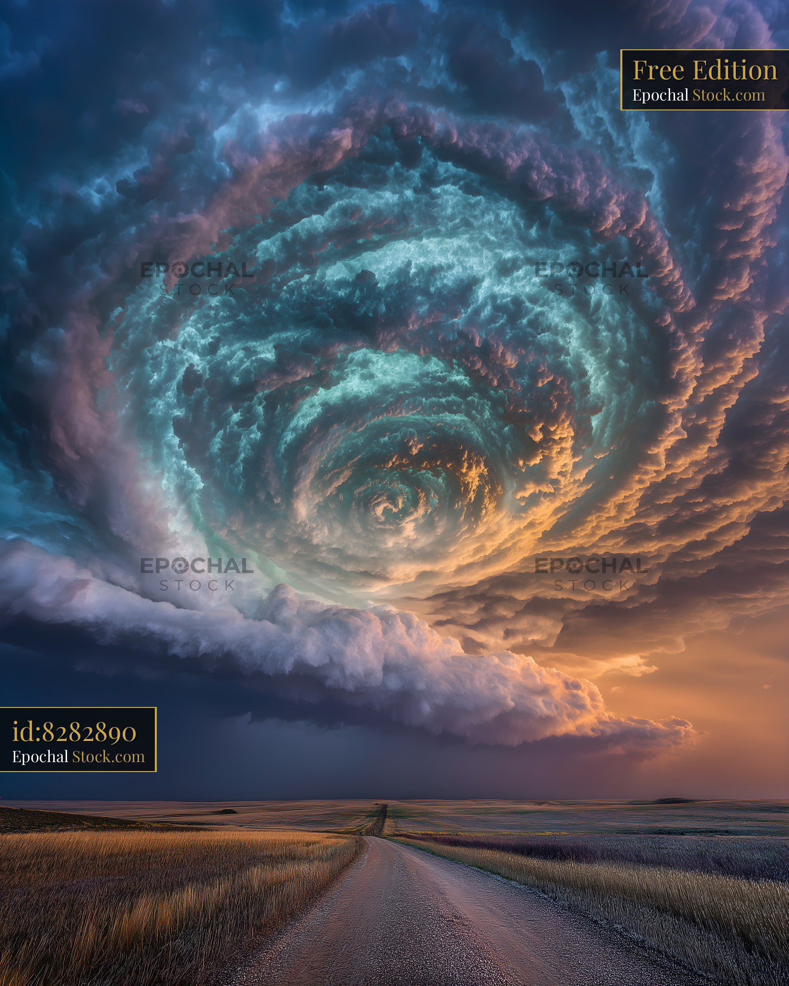 A road stretches into the distance under a swirling sky filled with clouds at sunset. The warm colors mix with the dark clouds creating a dramatic scene.