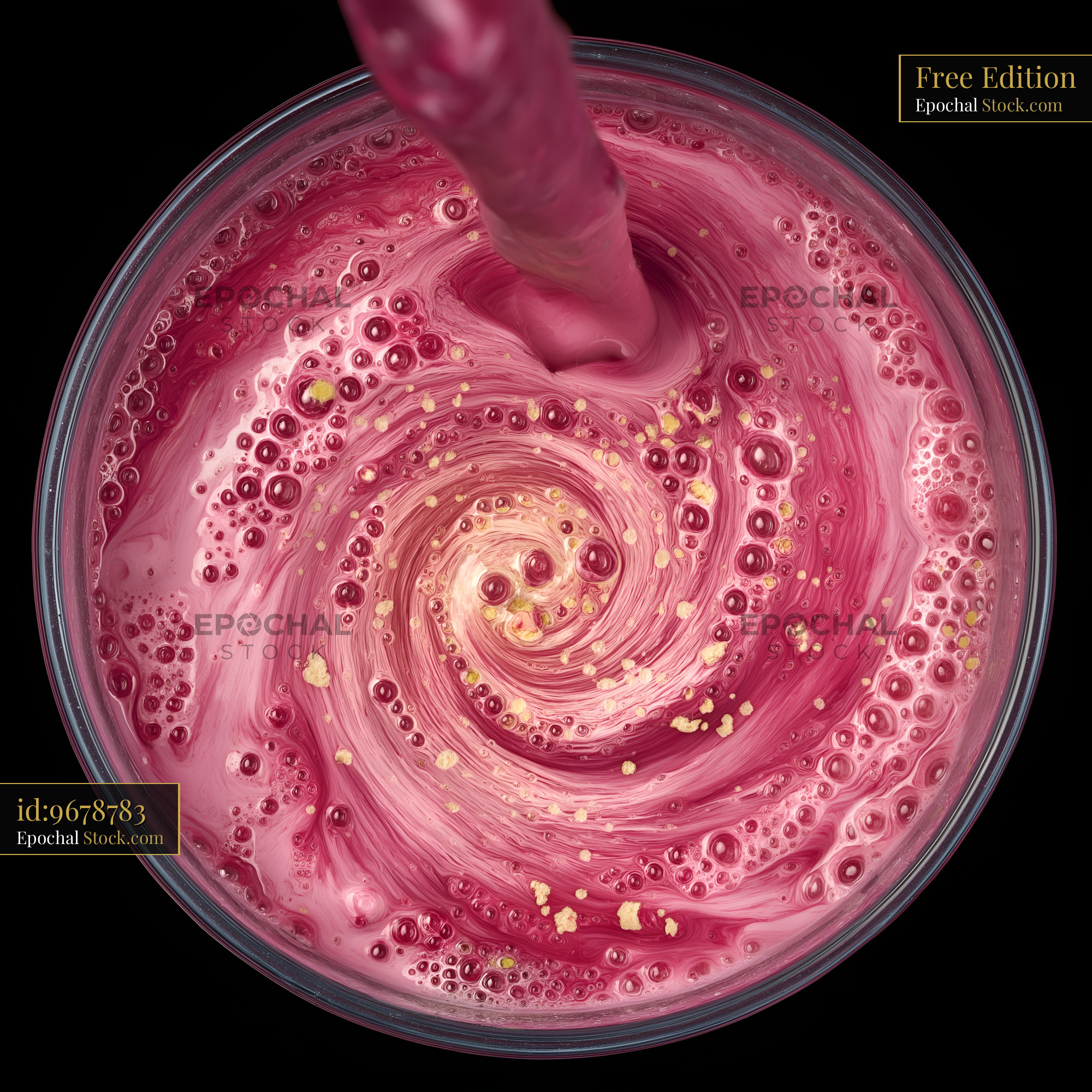 Bright pink liquid with bubbles swirls in a clear cup. The drink is being poured from above, creating a vibrant mix of colors in a round container.