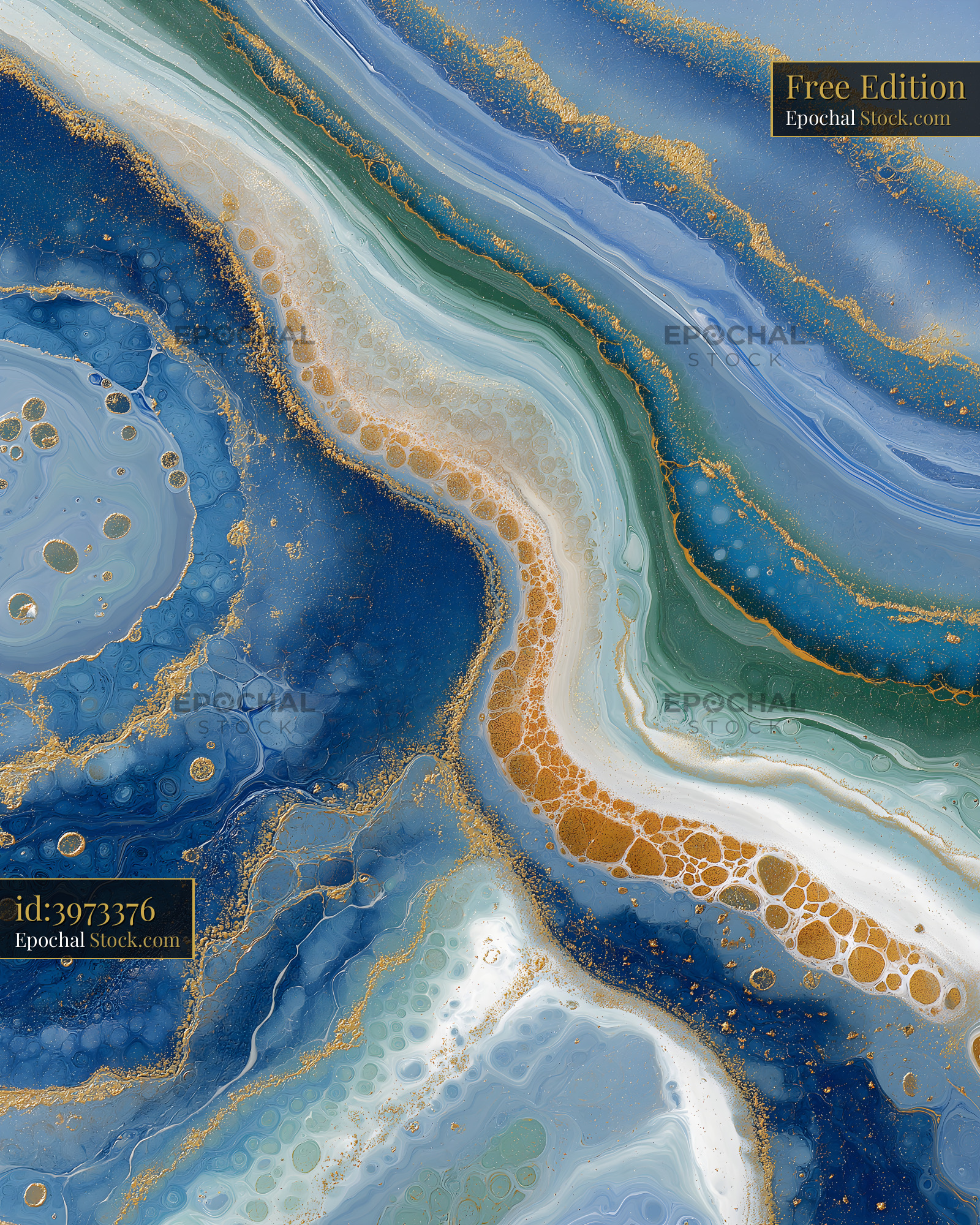 Swirling patterns of blue, green, and gold. The colors blend together in flowing lines and shapes. The design creates a sense of movement and depth.