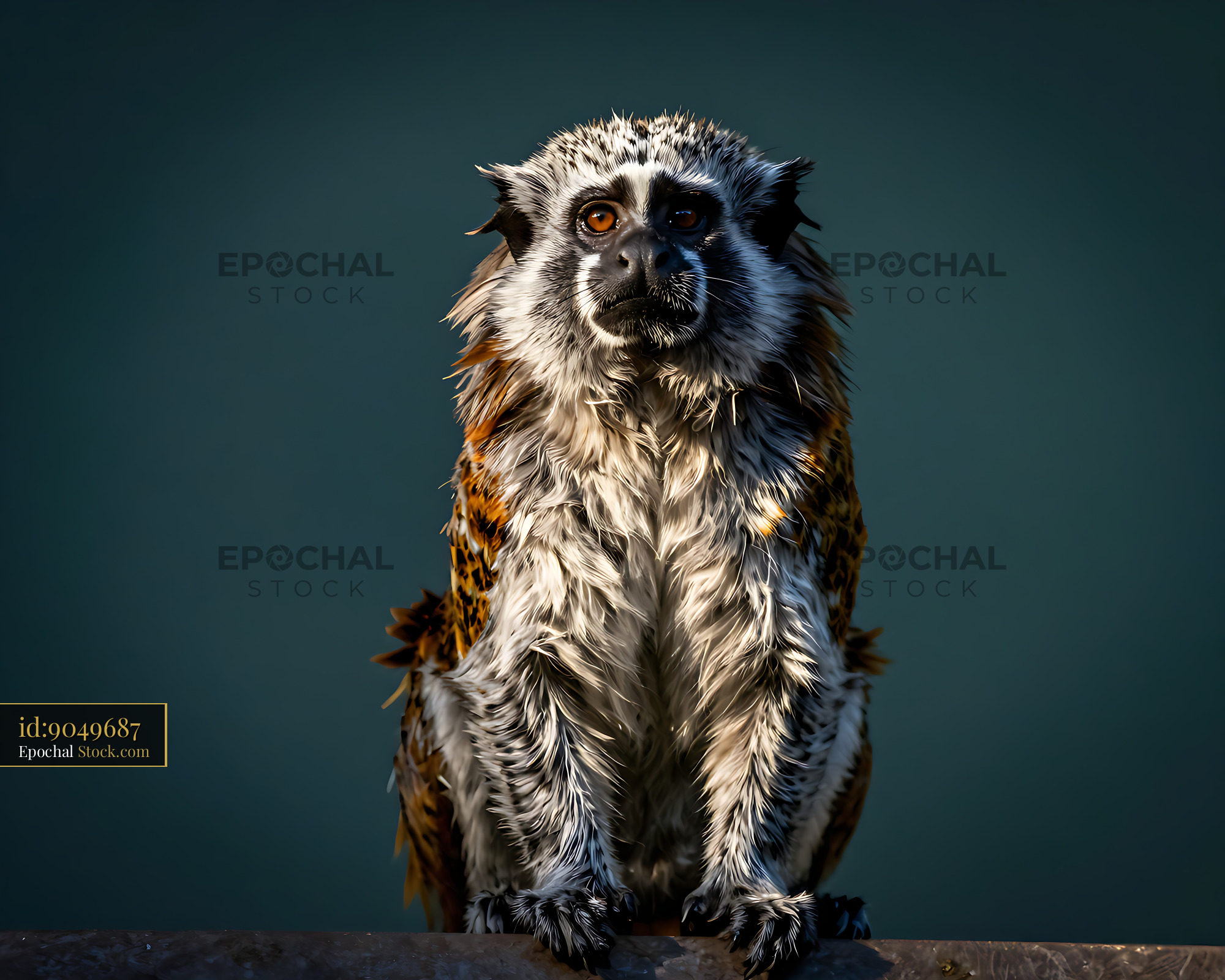 A close-up portrait of a tamarin monkey sitting calmly, featuring its intricate fur patterns and soulful gaze, highlighting the beauty and intelligence of tropical primates.