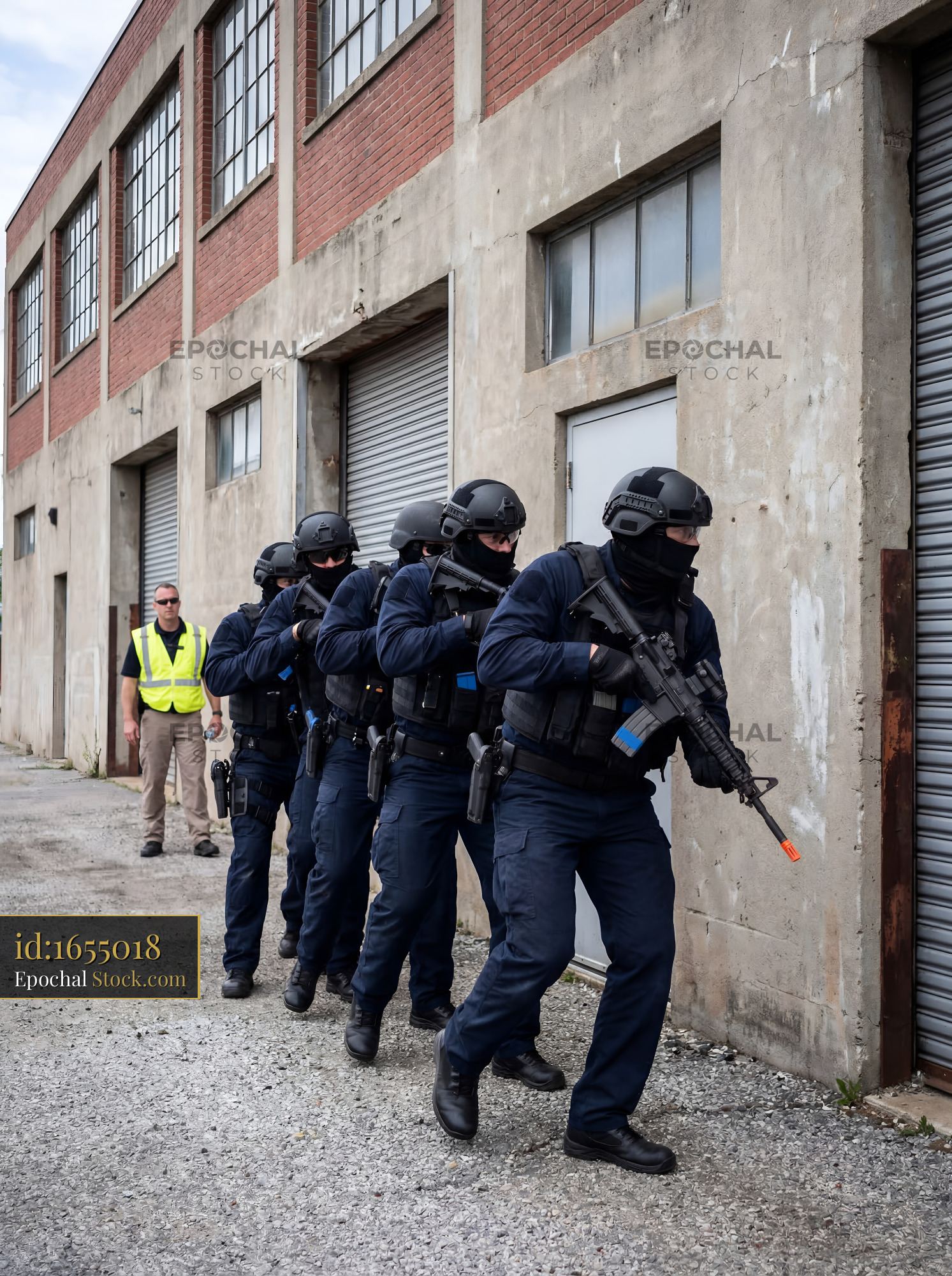 A group of officers in tactical gear walks in a line toward a building. They carry weapons and are focused on their task. A person in a vest observes from the side. This happens during daylight.
