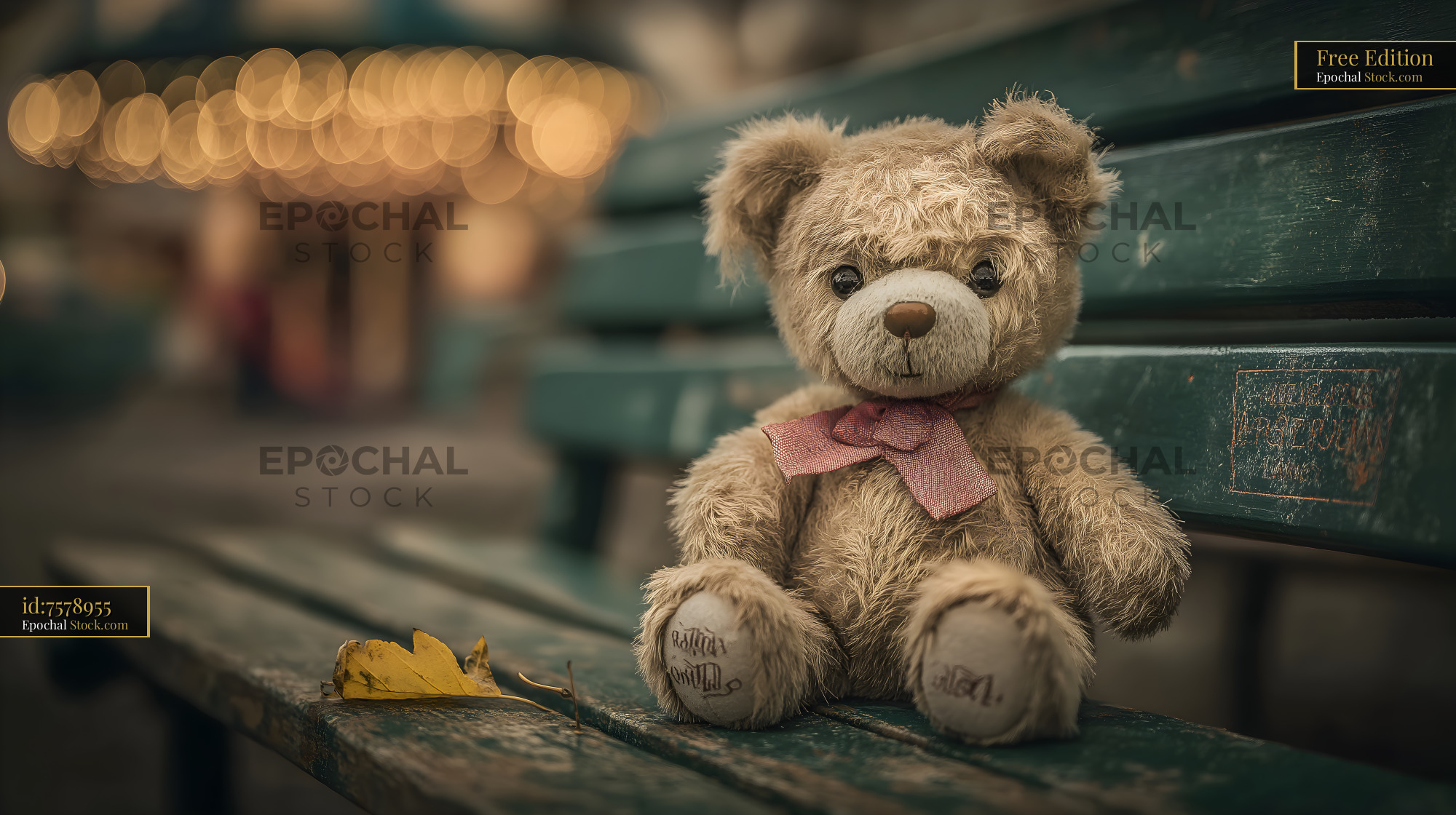 A teddy bear with a pink bow sits on a green bench. There is a yellow leaf near it. Soft lights from a nearby carousel glow in the background during the evening.