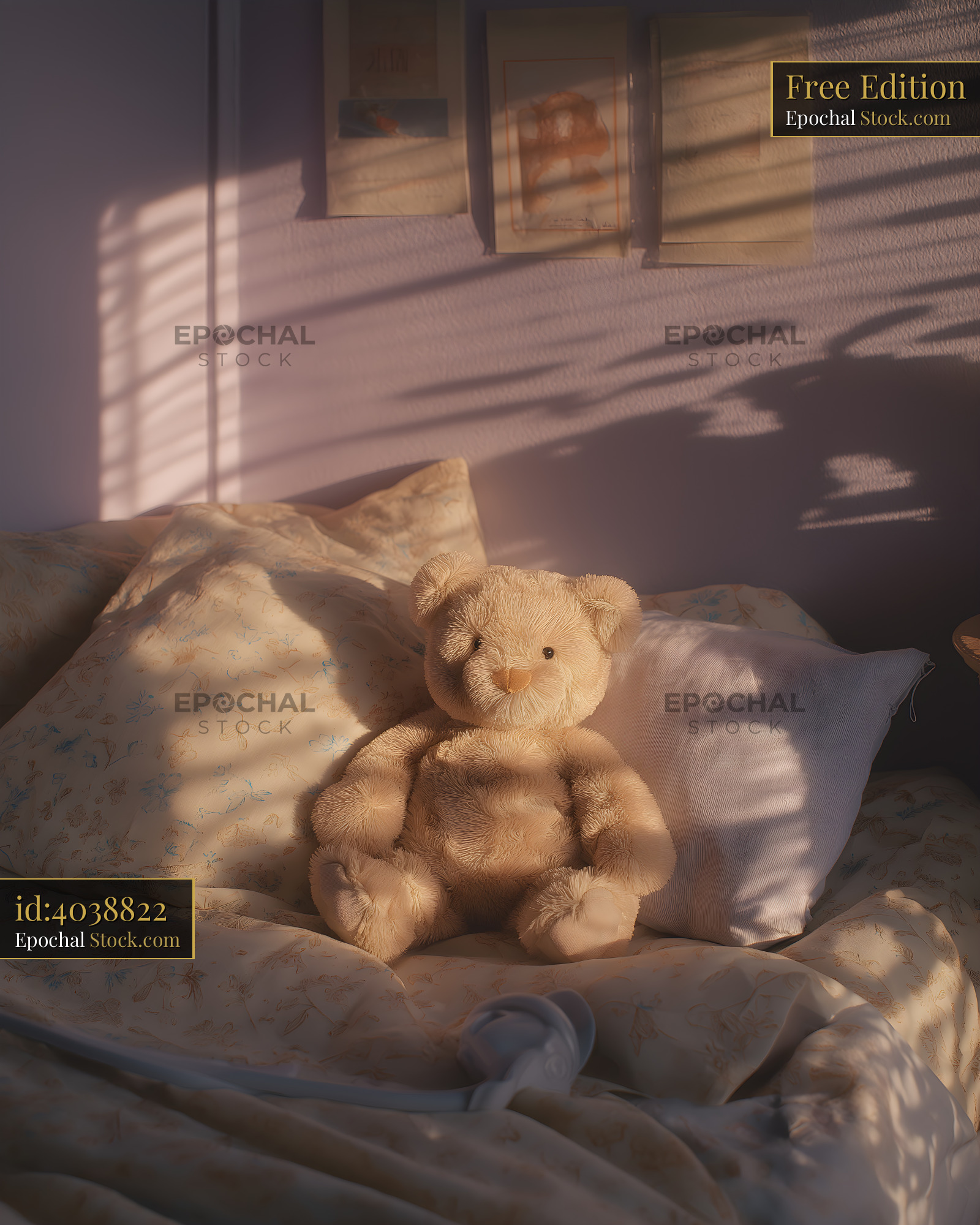 Teddy bear sits on bed in warm light during afternoon Free Premium Stock Image