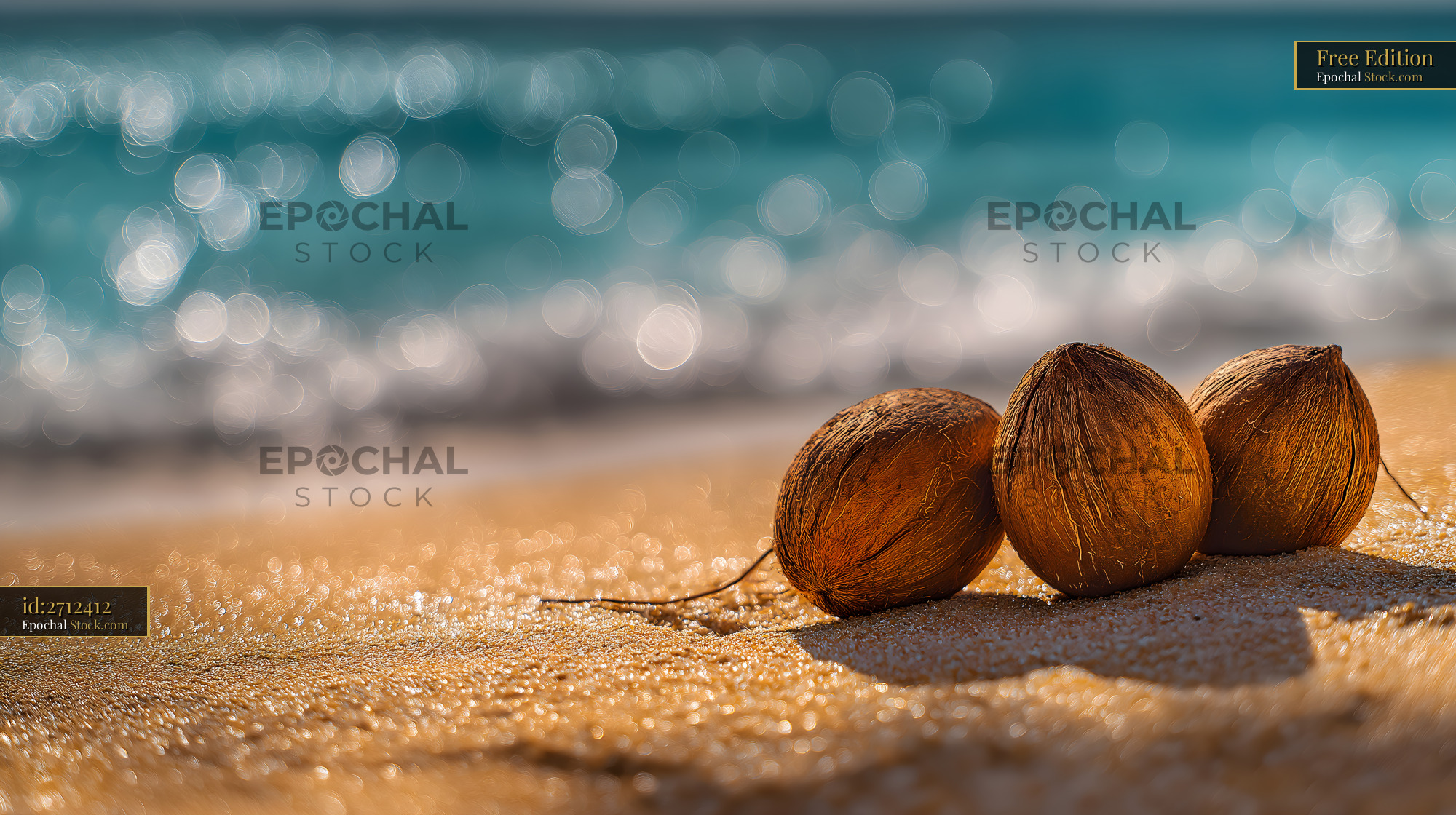 Three coconuts rest on sandy beach as ocean waves roll in. The sun shines down, creating a warm scene near the water. The beach is calm and inviting.