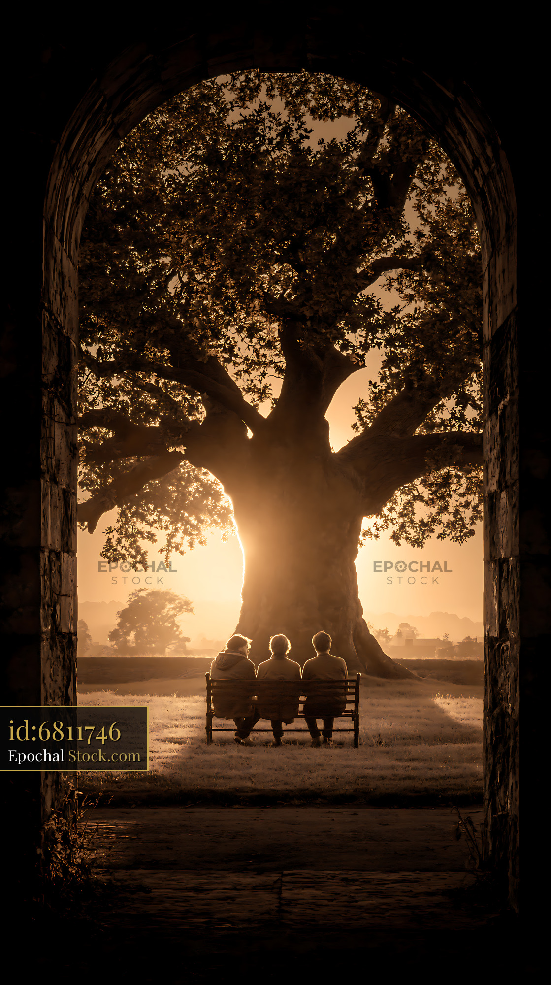 Three friends enjoy a quiet moment of reflection on a bench under a majestic ancient tree, framed by a stone archway during a warm golden sunset, symbolizing friendship and legacy.