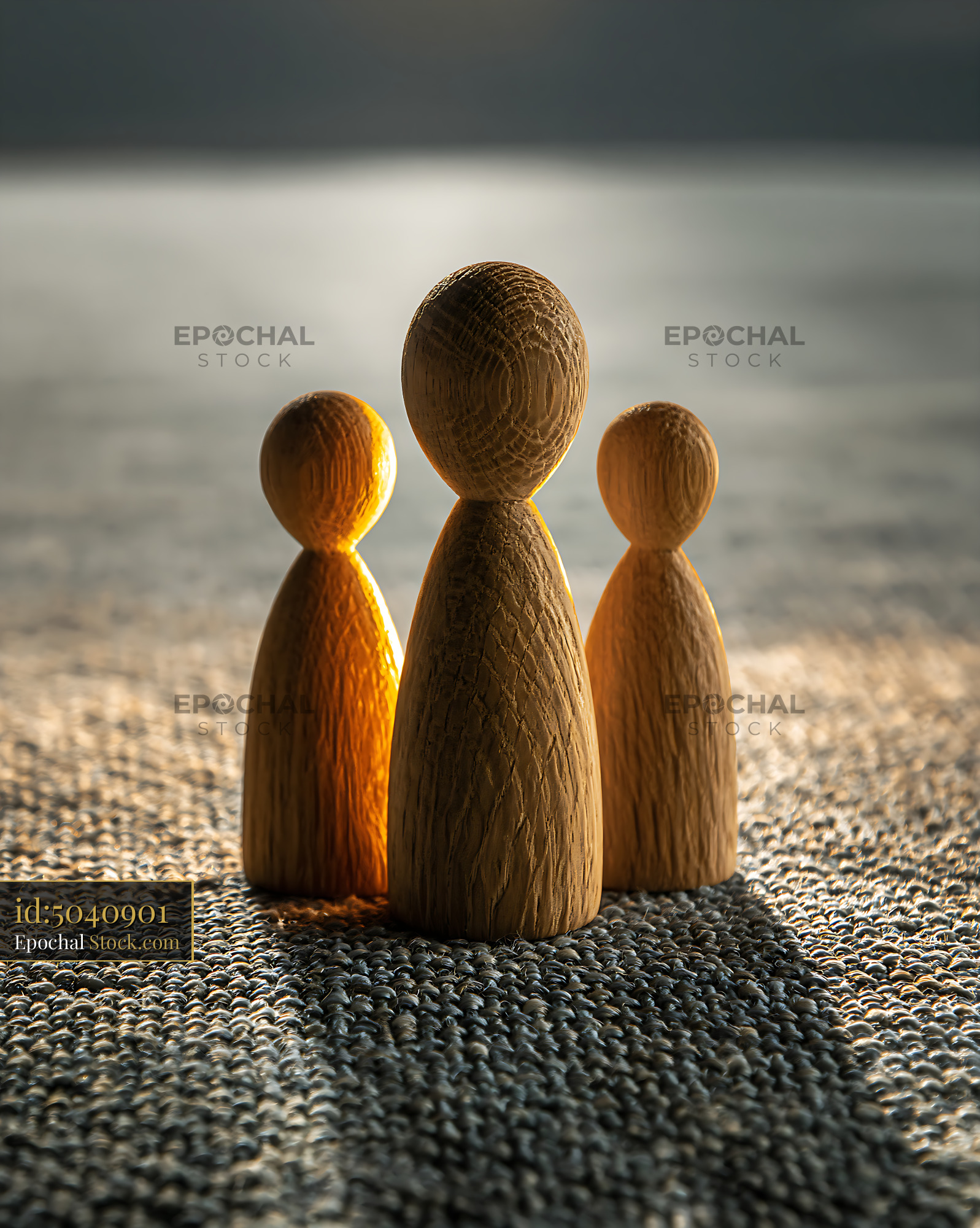 A minimalist arrangement of three wooden figures stands together in soft golden light, symbolizing family unity, protection, and the bond between parent and children.