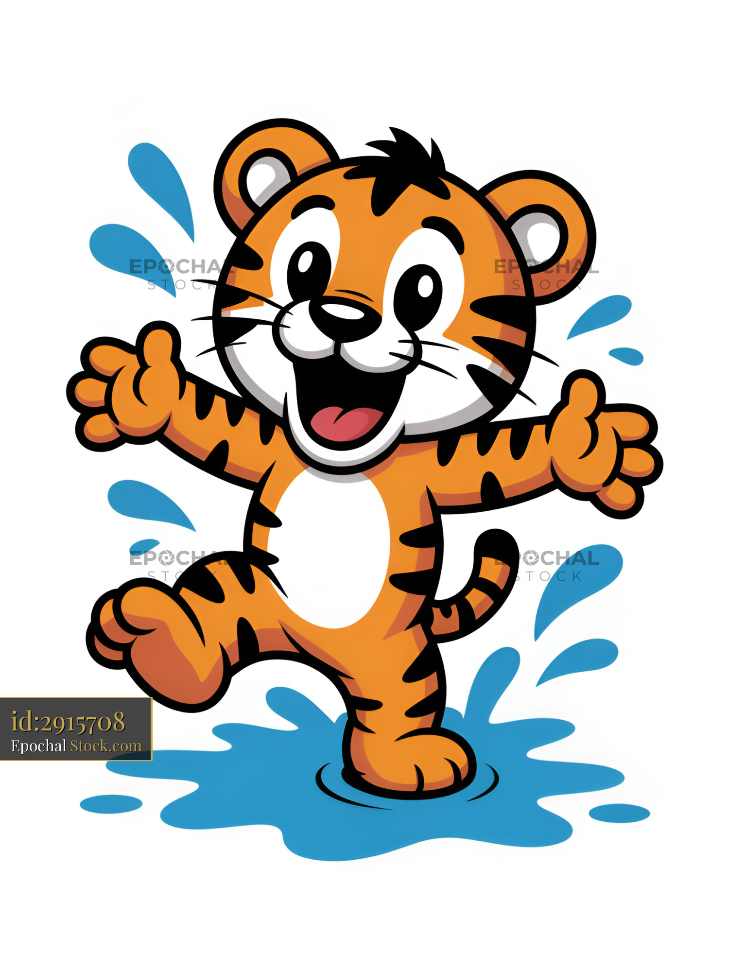 A playful tiger cub stands in a shallow pool of water. It holds out its arms with a big smile. Water splashes around as it enjoys its fun in the sunny setting.