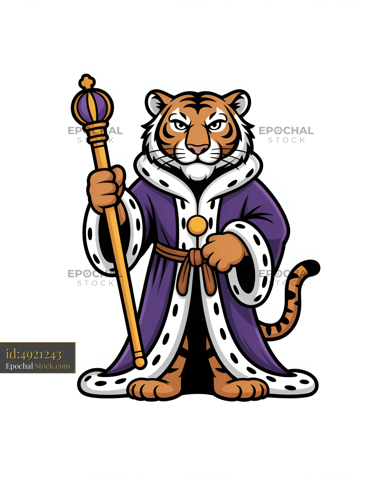 A tiger stands upright wearing a purple royal robe with white trim. The tiger holds a golden scepter in one paw, showing a strong and confident pose. The background is plain white.