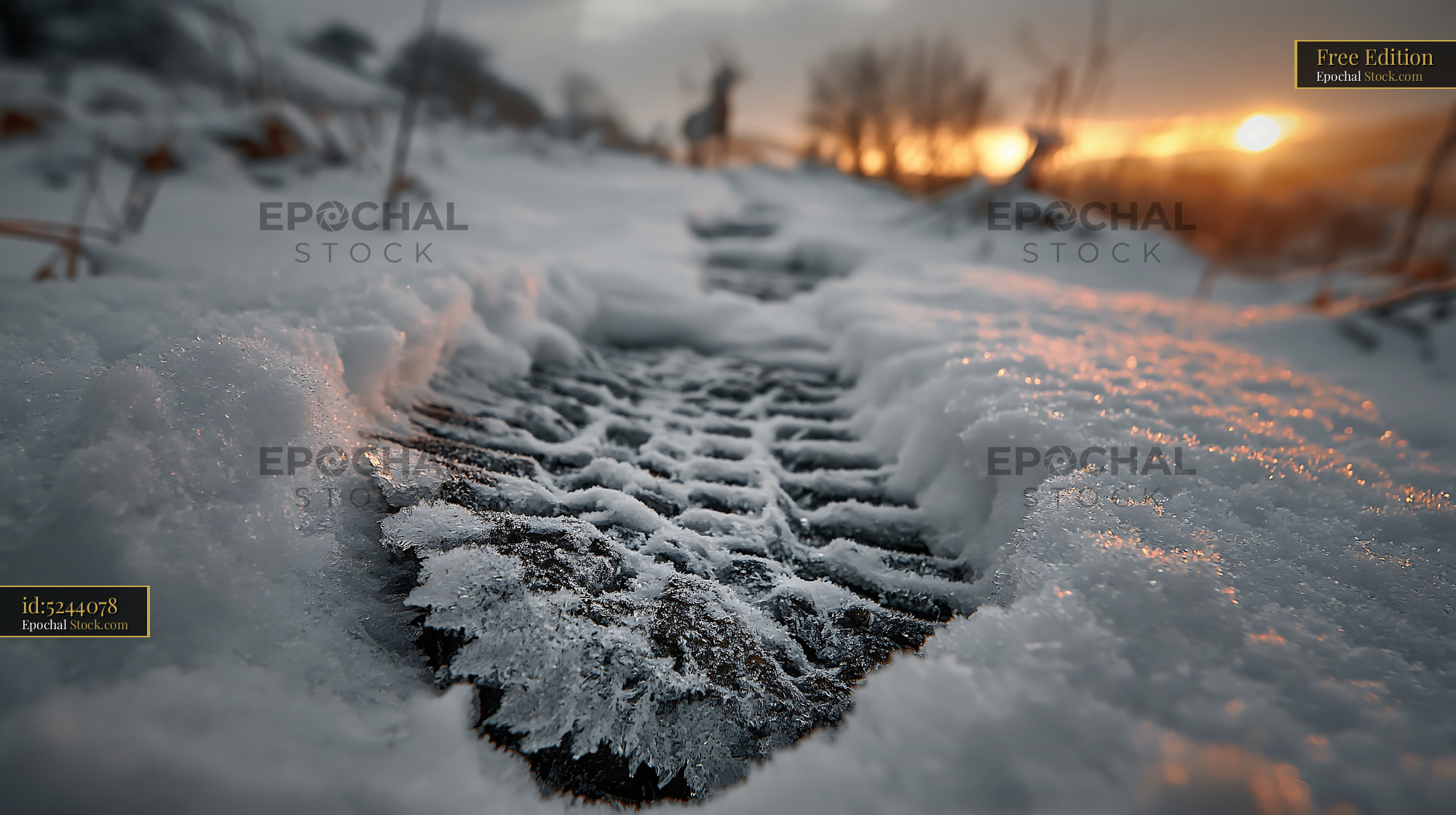 A detailed tire print in frozen snow reflects the orange glow of a winter sunset, evoking themes of solitude and the quiet aftermath of a midnight celebration where only memories remain.