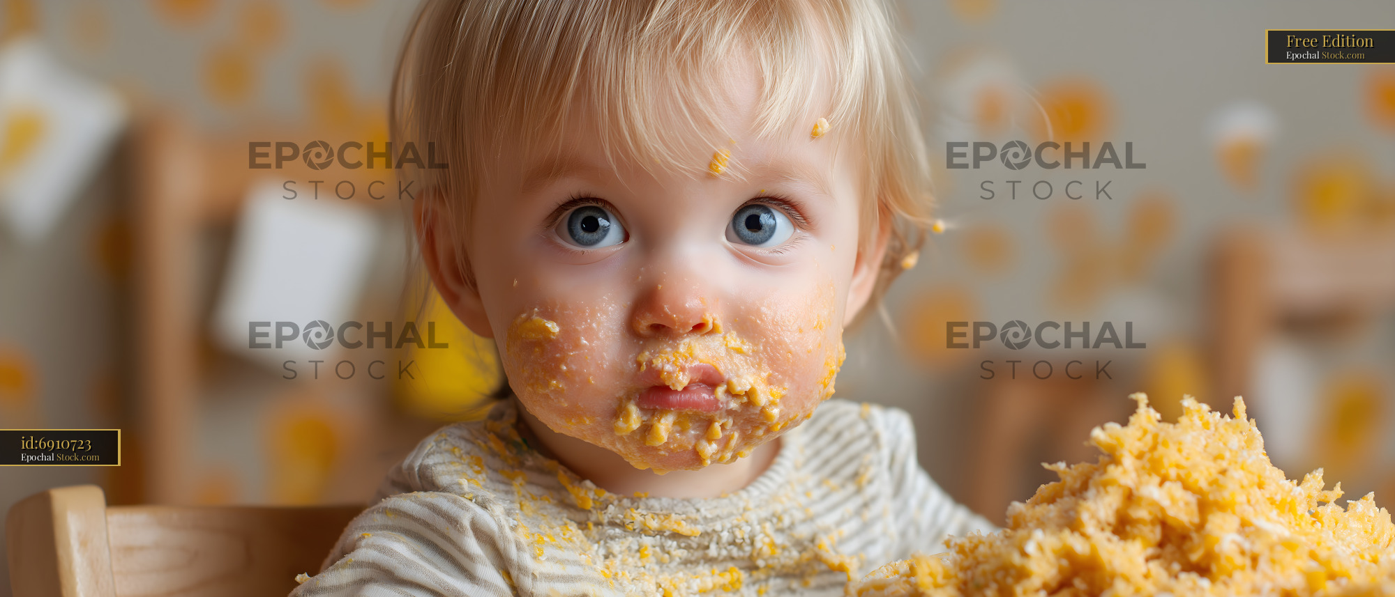 Toddler enjoying a messy meal with food on their face Free Premium Stock Image