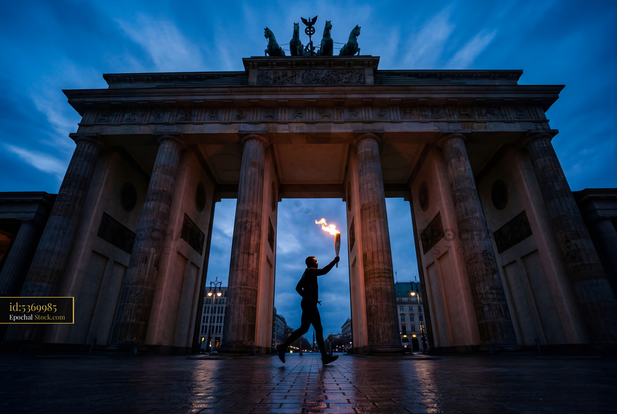 Torch bearer walks through Brandenburg Gate at dusk Premium Stock Photo