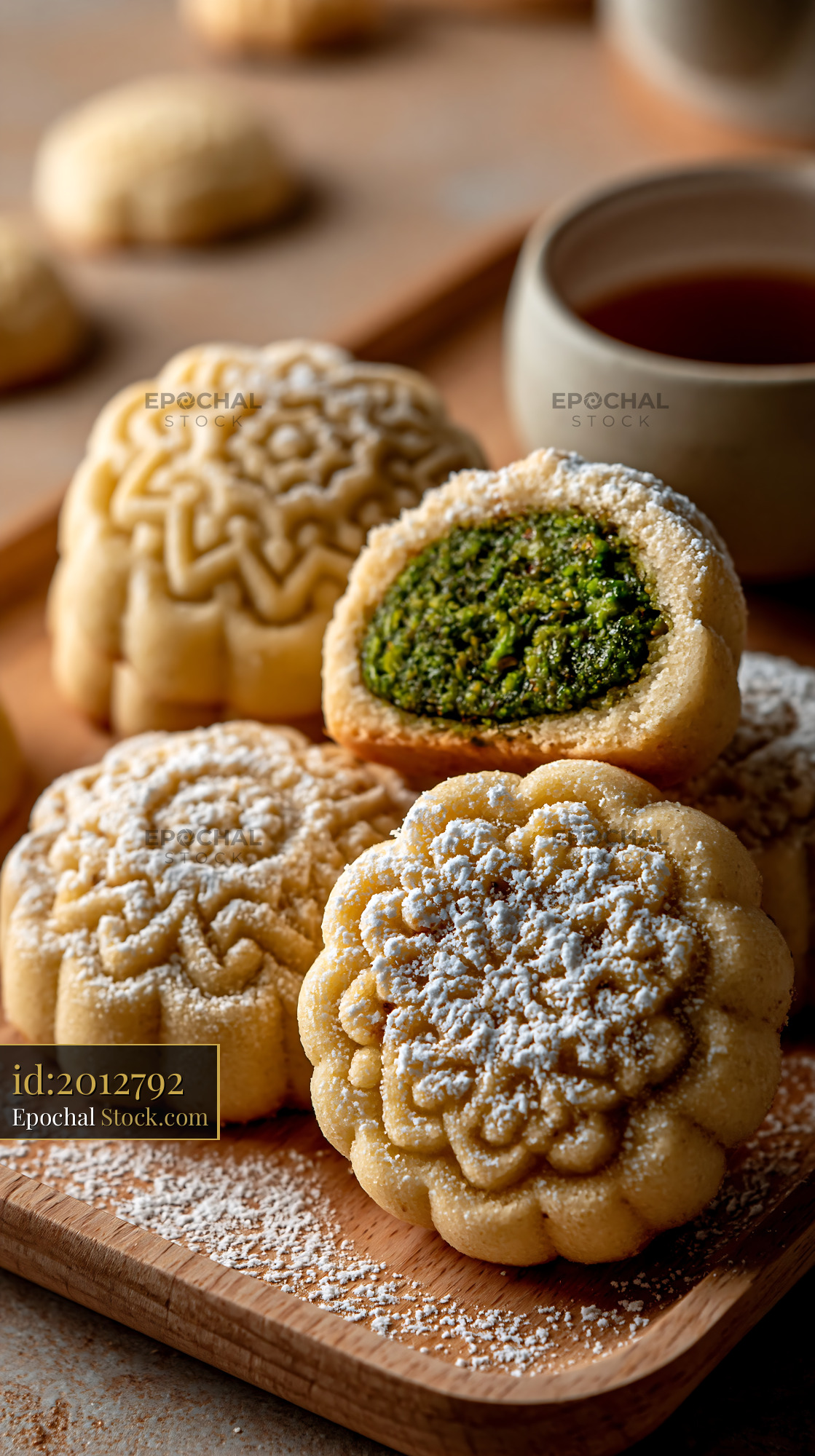 Traditional pistachio maamoul biscuits with green nut filling on a woo