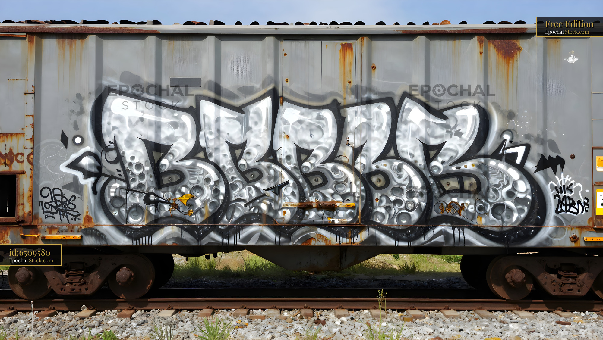 Train car displays graffiti along railway tracks in a sunny area Free Premium Stock Photo