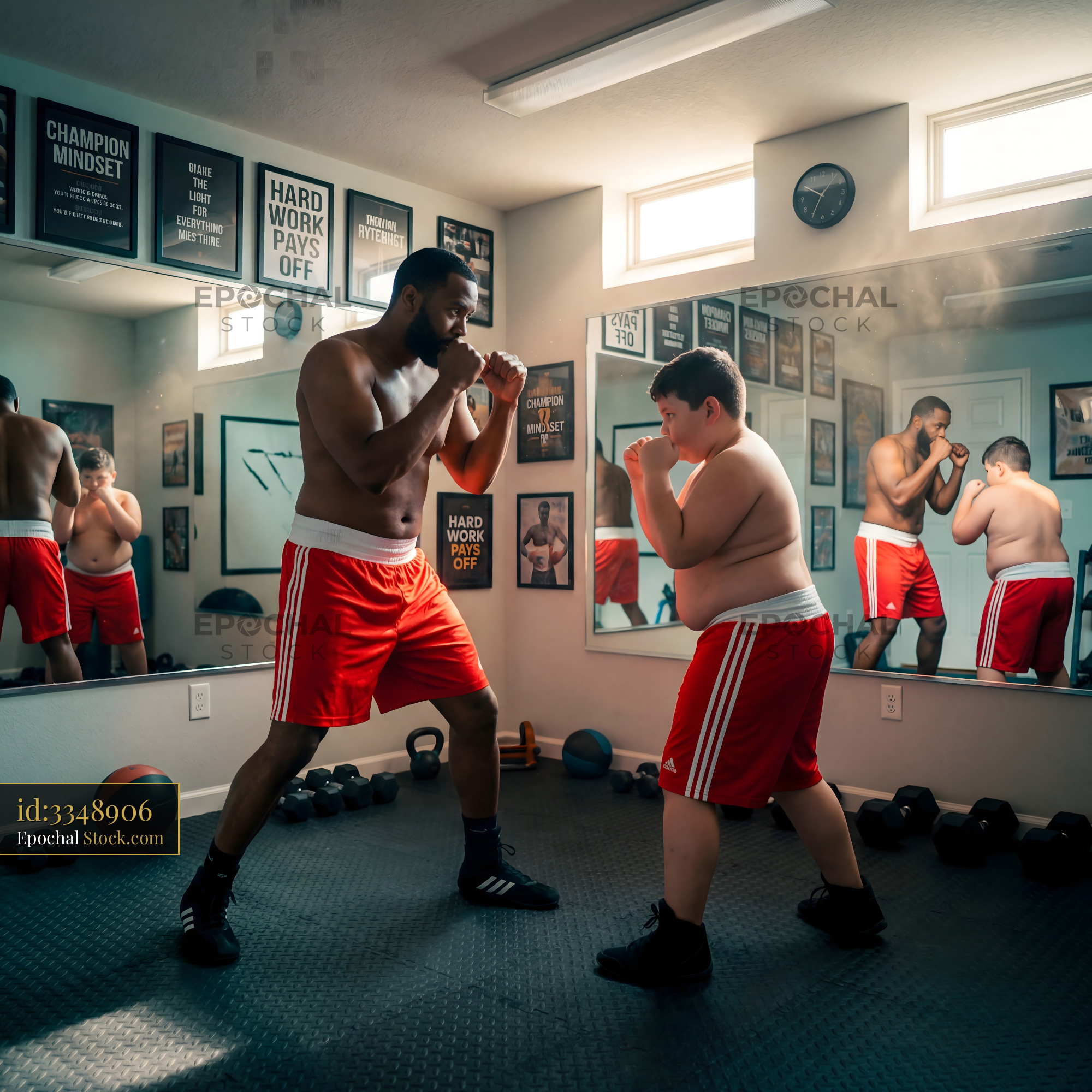A coach and a student practice boxing techniques in a gym. The room has mirrors and posters on the walls. They focus on improving skills and building confidence during their time together.