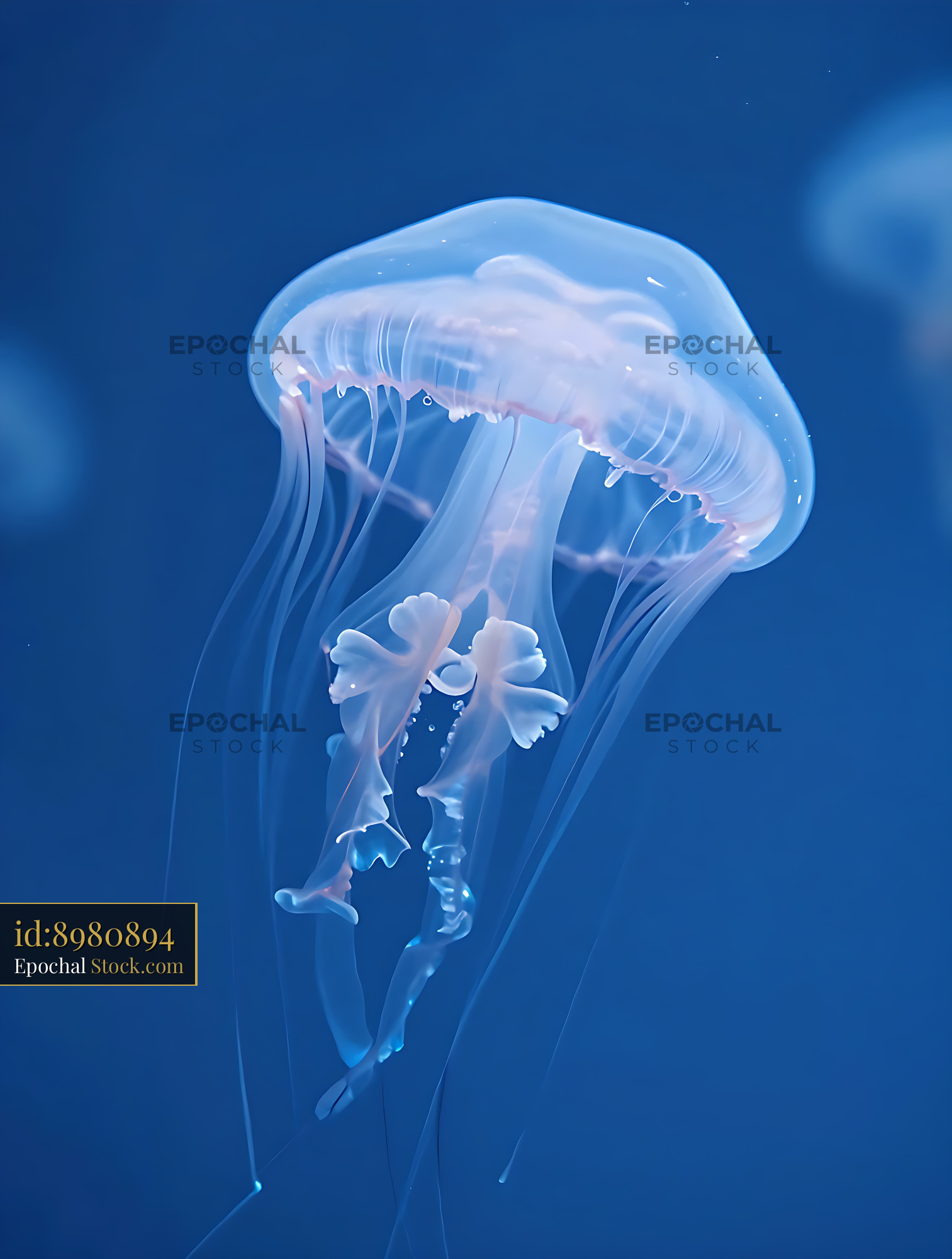 A delicate jellyfish with a luminous bell and flowing tentacles glides gracefully through the deep blue sea. The ethereal creature embodies themes of mystery, fragility, and the otherworldly beauty of marine life in the ocean depths.
