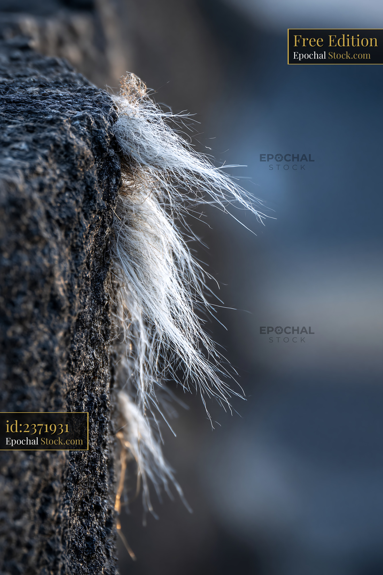 A close-up shot of a tuft of white animal fur snagged on the sharp edge of a dark, weathered stone, symbolizing traces of wildlife, passage, and the remnants of nature in a quiet, moody setting.