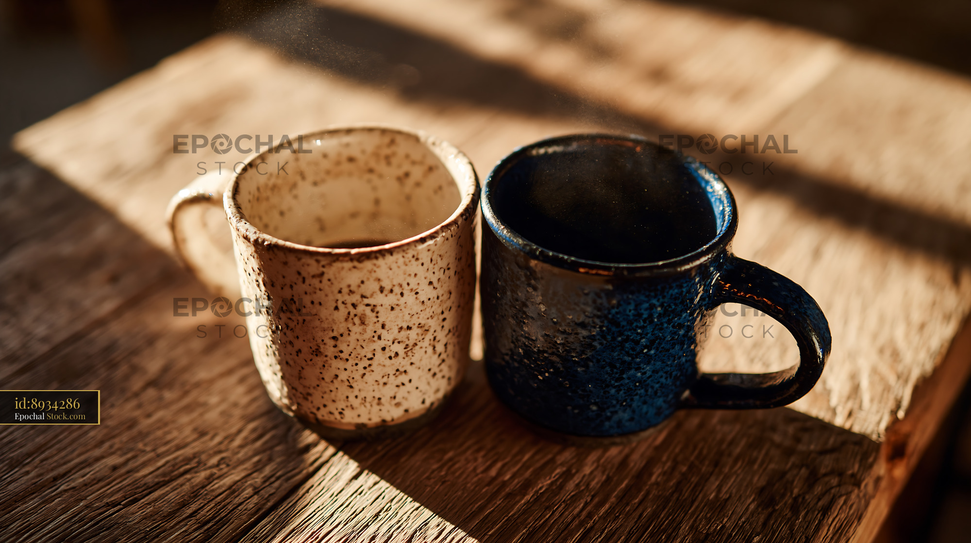 Two ceramic mugs on a rustic wooden table in morning sunlight