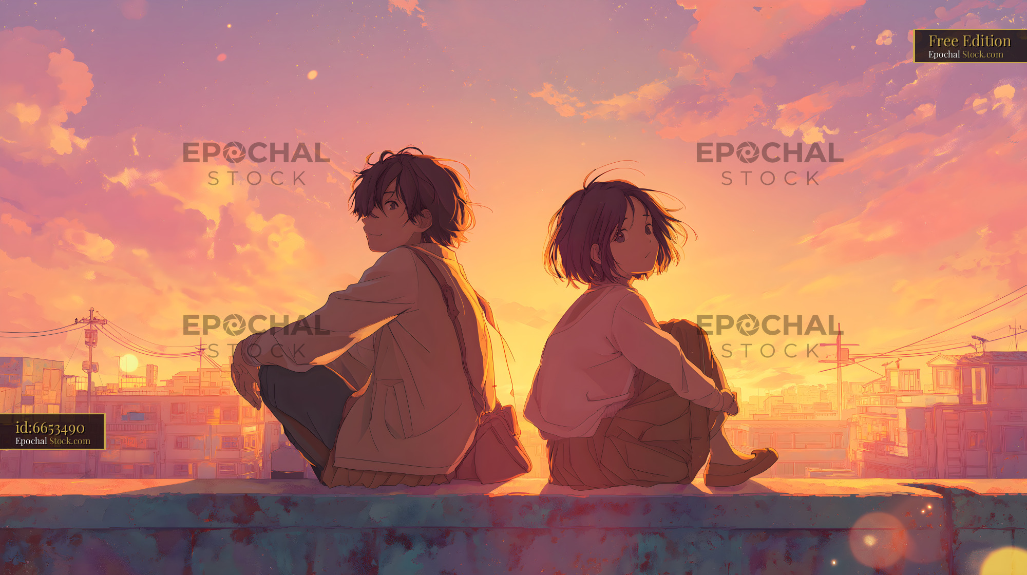 Two people are sitting on a wall in a city at sunset. They are facing away from each other. The sky is bright with colors and buildings are in the background.