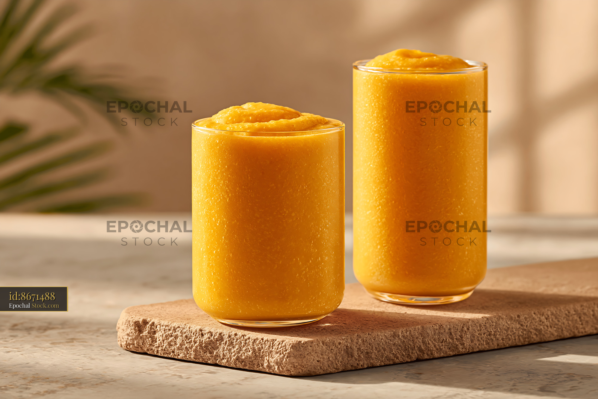 Two refreshing glasses of creamy pawpaw punch milkshake stand on a textured stone board in warm sunlight, evoking a feeling of tropical wellness, healthy indulgence, and summer refreshment.