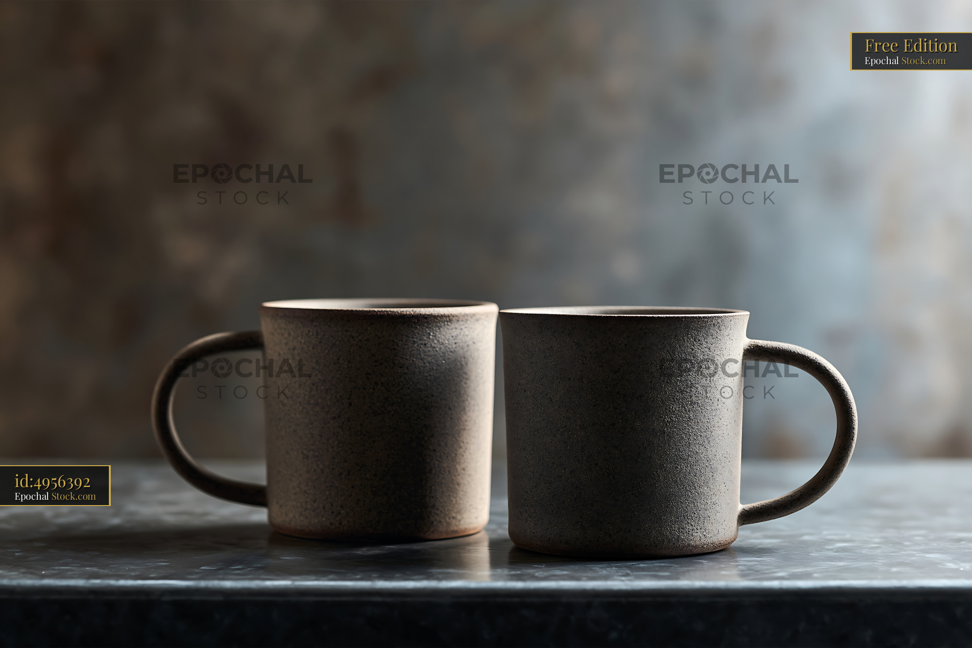 Two rustic ceramic mugs on a dark stone surface in soft light