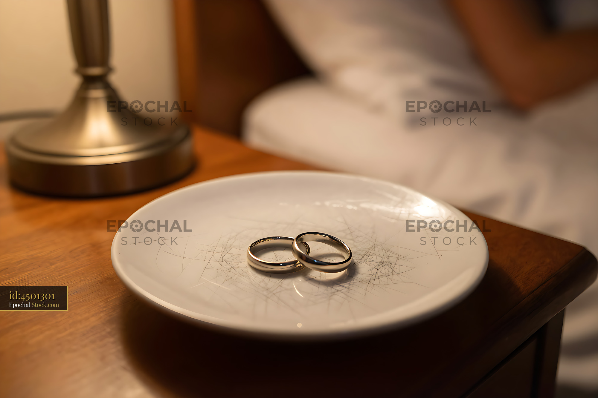 A pair of silver wedding bands rests on a small ceramic dish on a bedside table, evoking themes of marriage, commitment, or the quiet end of a relationship in a dimly lit bedroom.