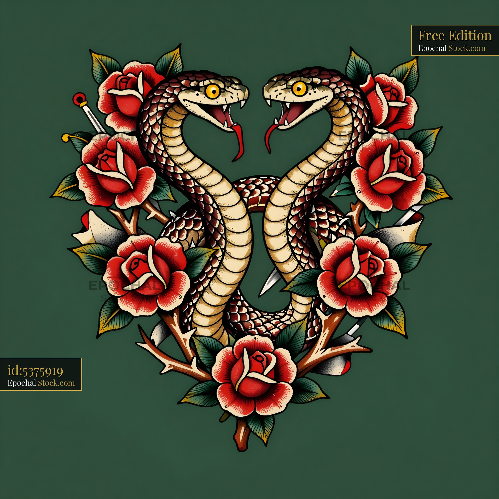 Two snakes face each other among red roses on a green background Free Premium Stock Image