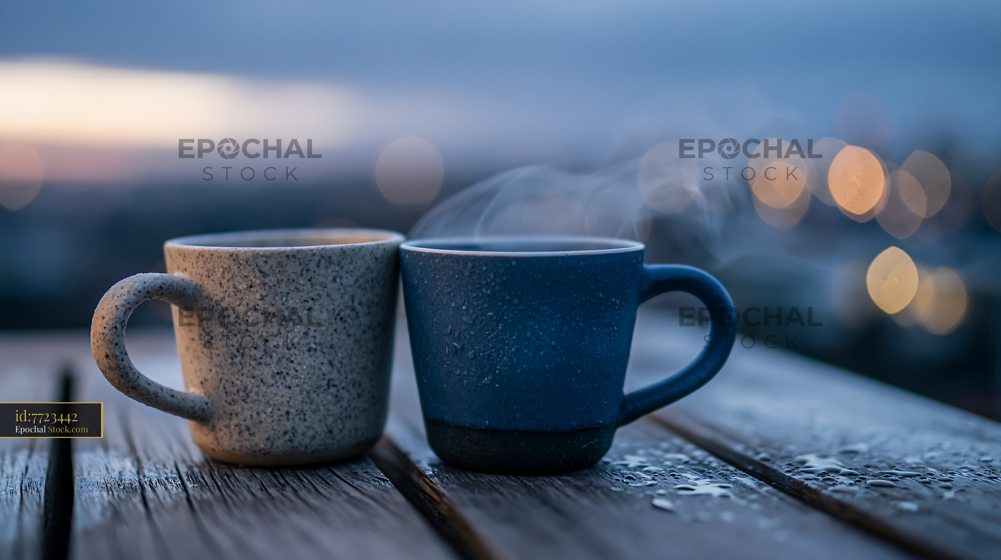 Two ceramic coffee mugs sit side by side on a wet wooden table with steam rising against a soft bokeh city background at dawn, evoking themes of calm, intimacy, and togetherness.
