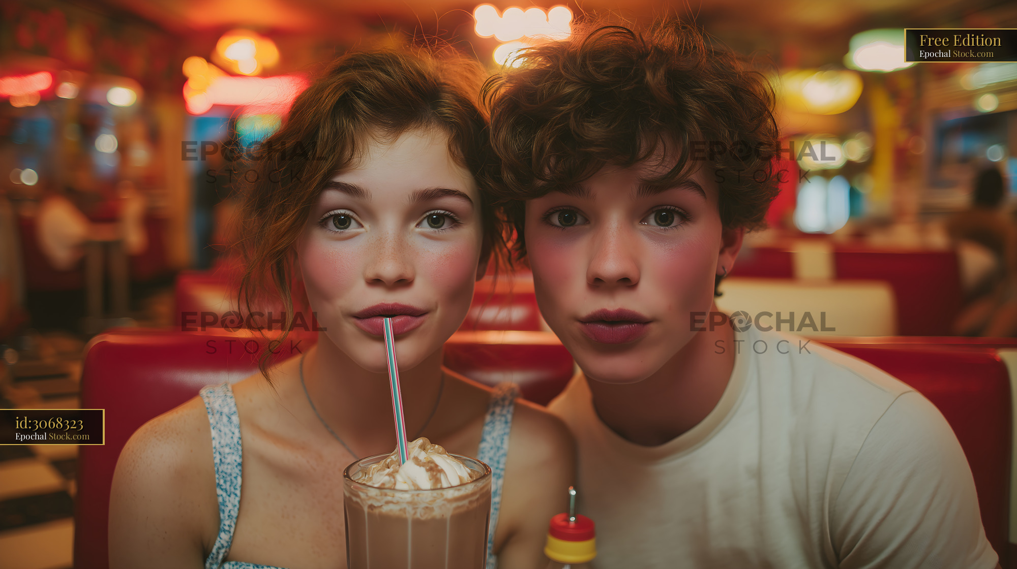 Two teens enjoy milkshake in retro diner setting Free Premium Stock Image
