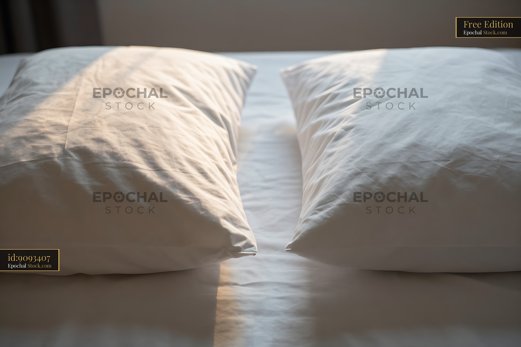 A pair of fresh white pillows rests on a clean bed as warm morning sunlight streams across the room, creating a peaceful atmosphere of rest and new beginnings.