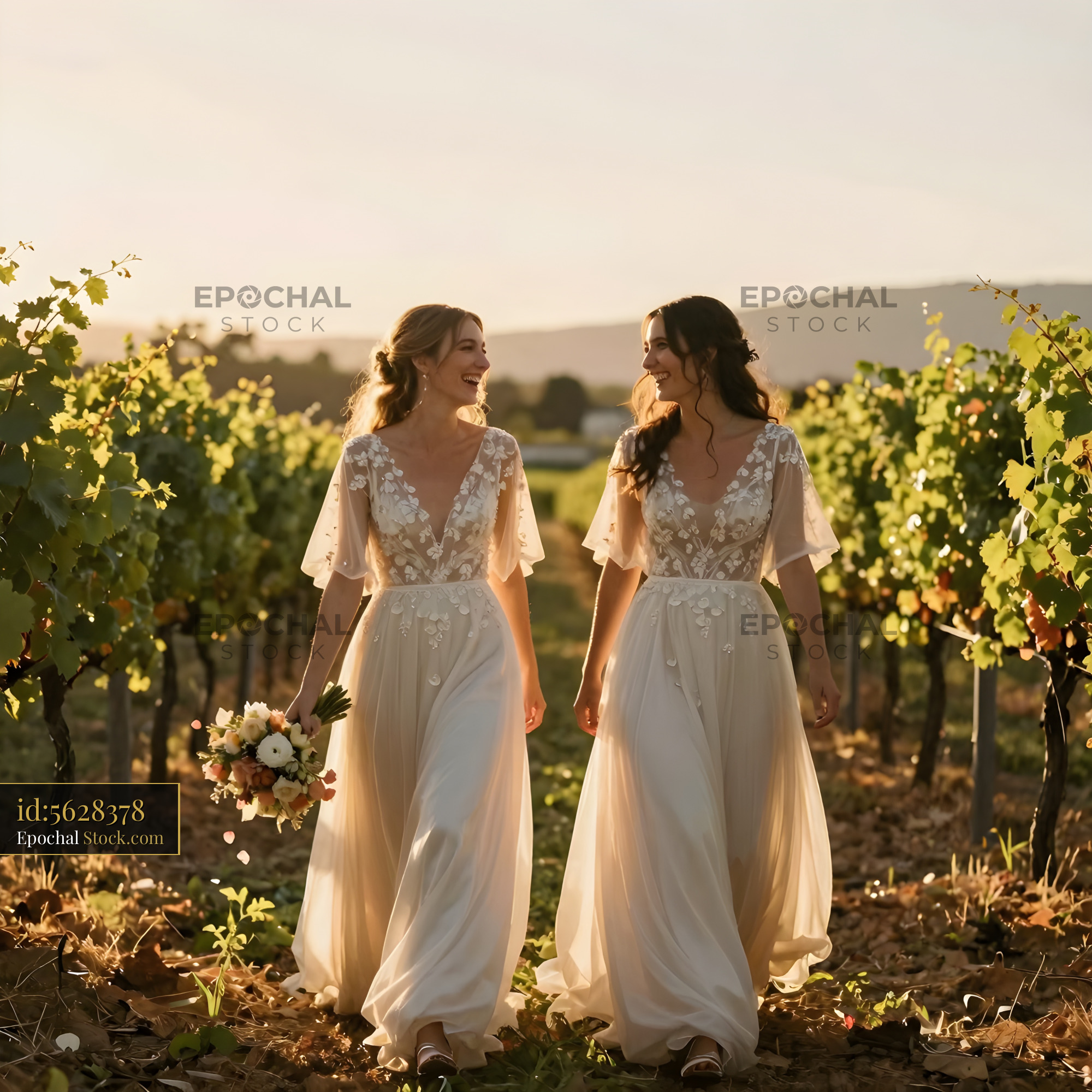 Two women walk through a vineyard with grapevines on both sides. They wear matching outfits and hold a bouquet of flowers. The sun sets in the background, creating a warm glow.