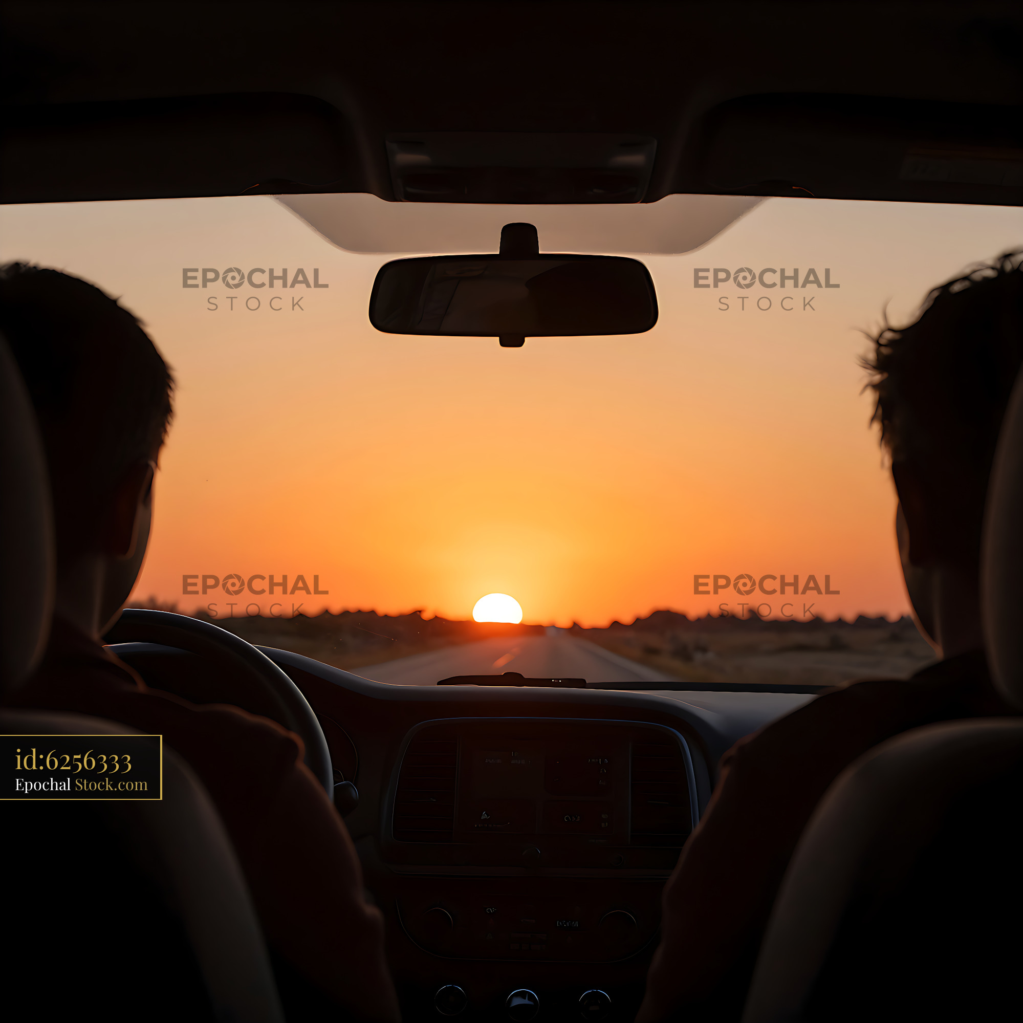Silhouettes of two friends in a car driving towards a vibrant orange sun on an open highway, evoking themes of freedom, adventure, and the bond of a shared journey.